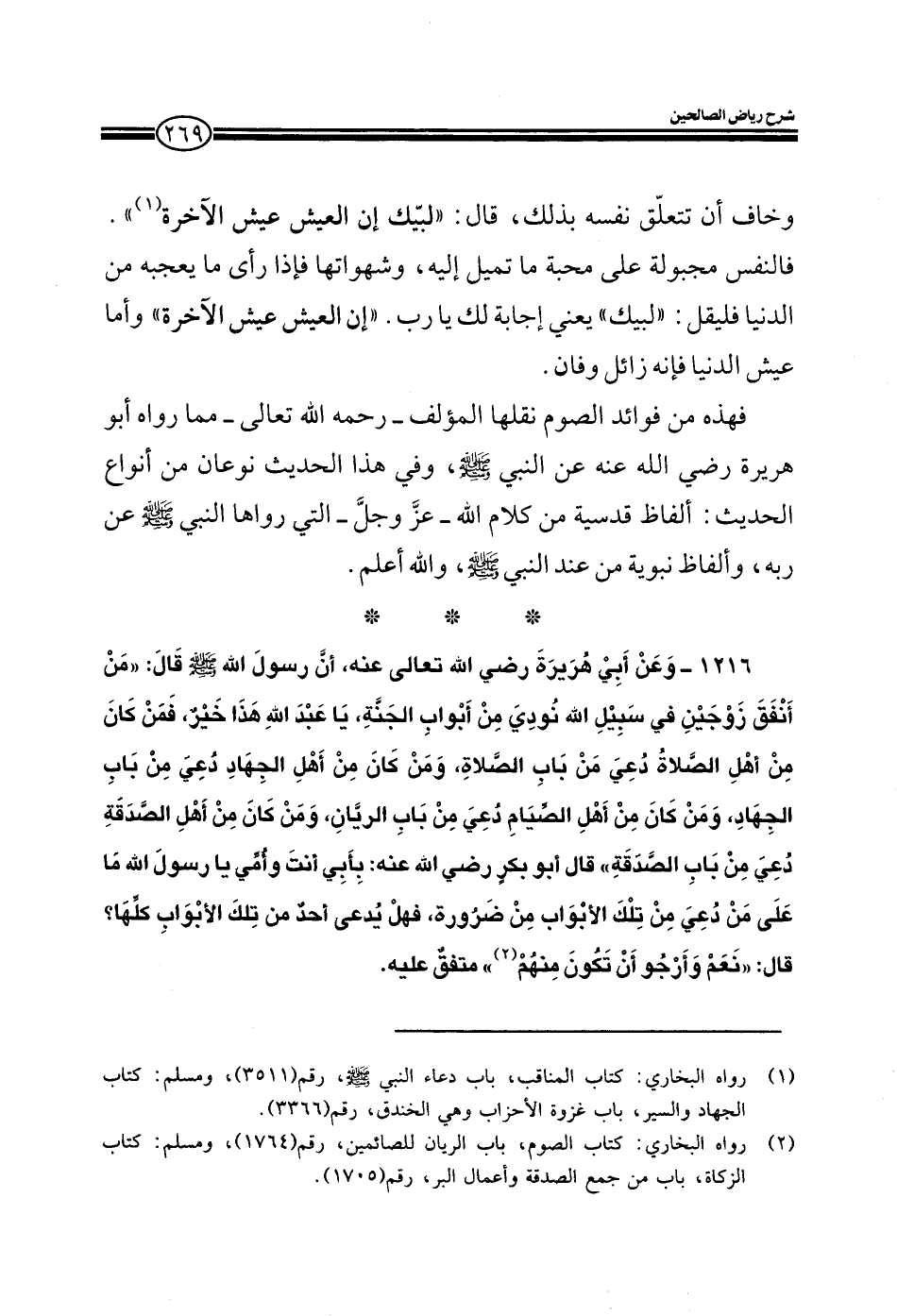 1216 - وعن أبي هريرة رضي الله عنه أن رسول الله صلى الله عليه وسلم قال: من أنفق زوجين في سبيل الله نودي من أبواب الجنة يا عبد الله هذا خير فمن كان من أهل الصلاة دعي من باب الصلاة ومن كان من أهل الجهاد دعي من باب الجهاد ومن كان من أهل الصيام دعي من باب الريان ومن كان من أهل الصدقة دعي من باب الصدقة قال أبو بكر رضي الله عنه بأبي أنت وأمي يا رسول الله ما على من دعي من تلك الأبواب من ضرورة فهل يدعى أحد من تلك الأبواب كلها قال: نعم وأرجو أن تكون منهم متفق عليه.