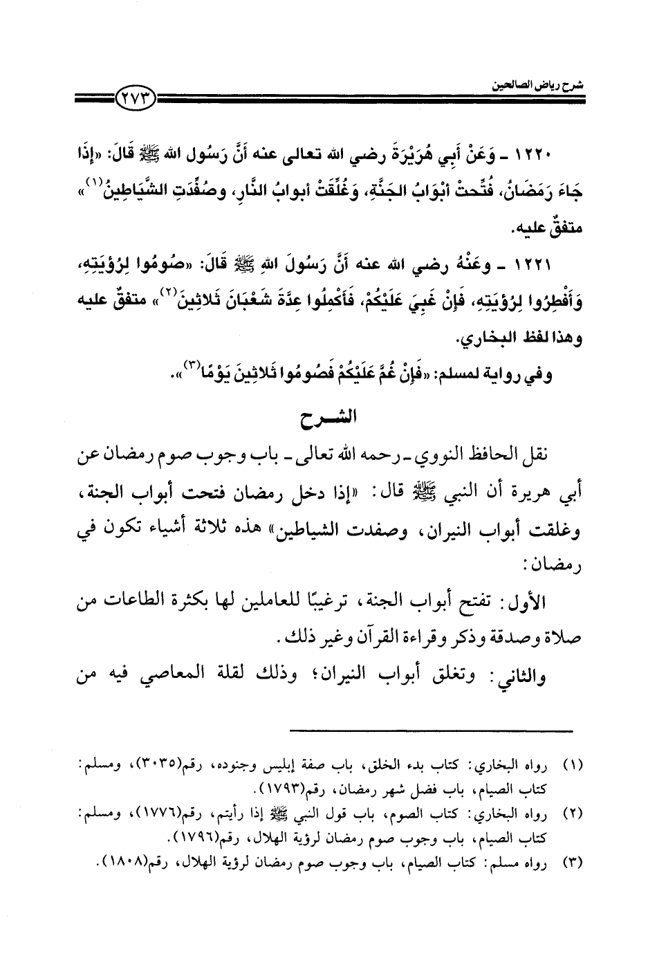 EXنقل النووي رحمه الله في كتابه رياض الصالحين في باب وجوب صوم رمضان عن أبي هريرة أن النبي صلى الله عليه وسلم قال: إذا دخل رمضان فتحت أبواب الجنة، وغلقت أبواب النيران، وصفدت الشياطين.