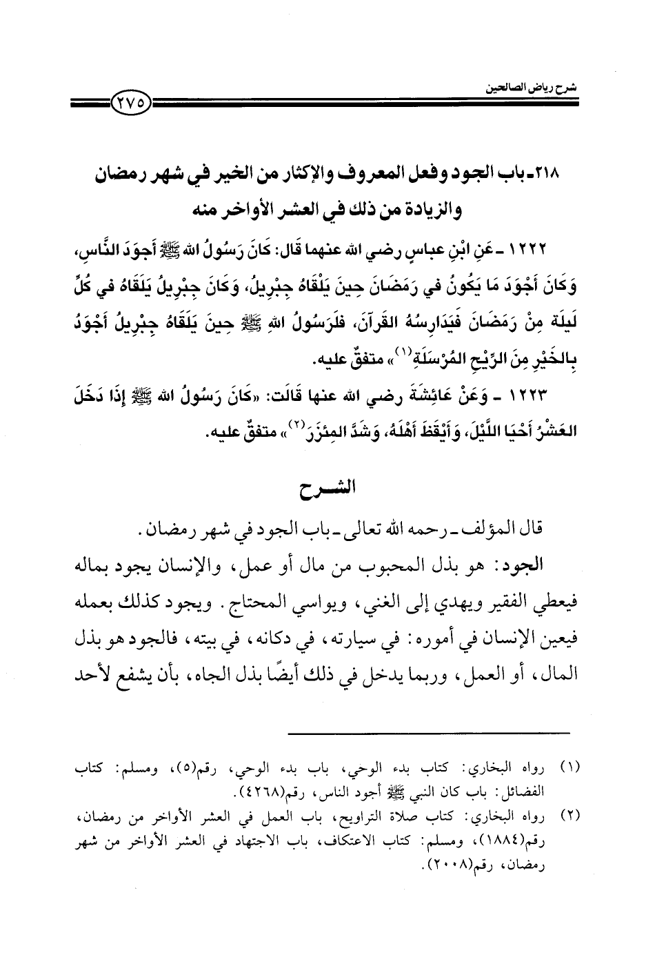 باب الجود وفعل المعروف والإكثار من الخير في شهر رمضان والزيادة من ذلك في العشر الأواخر منه
