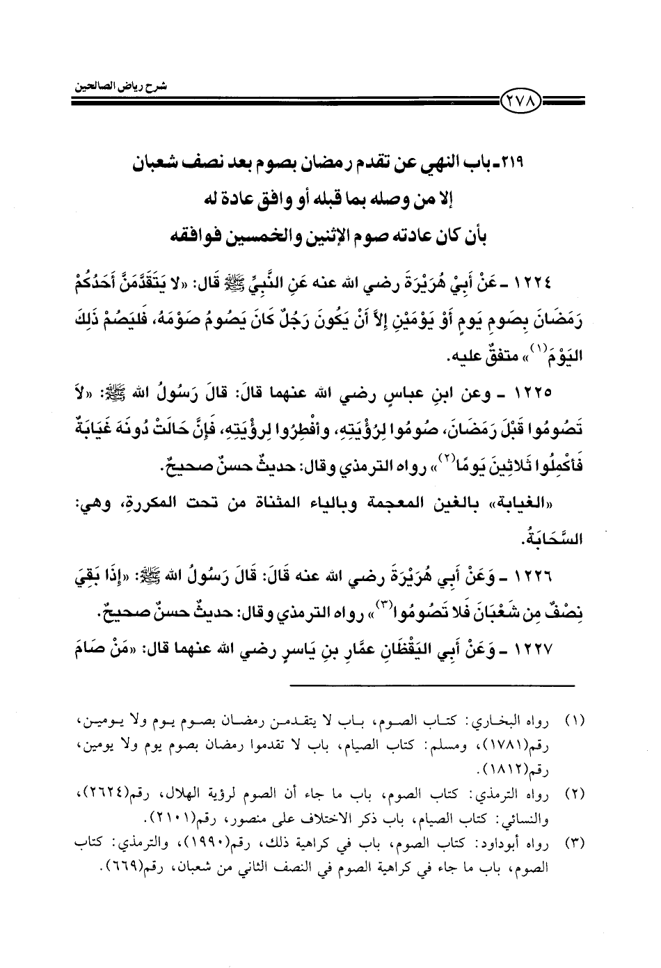 1224 - عن أبي هريرة رضي الله عنه عن النبي صلى الله عليه وسلم قال: لا يتقدمن أحدكم رمضان بصوم يوم أو يومين إلا أن يكون رجل كان يصوم صومه فليصم ذلك اليوم متفق عليه.