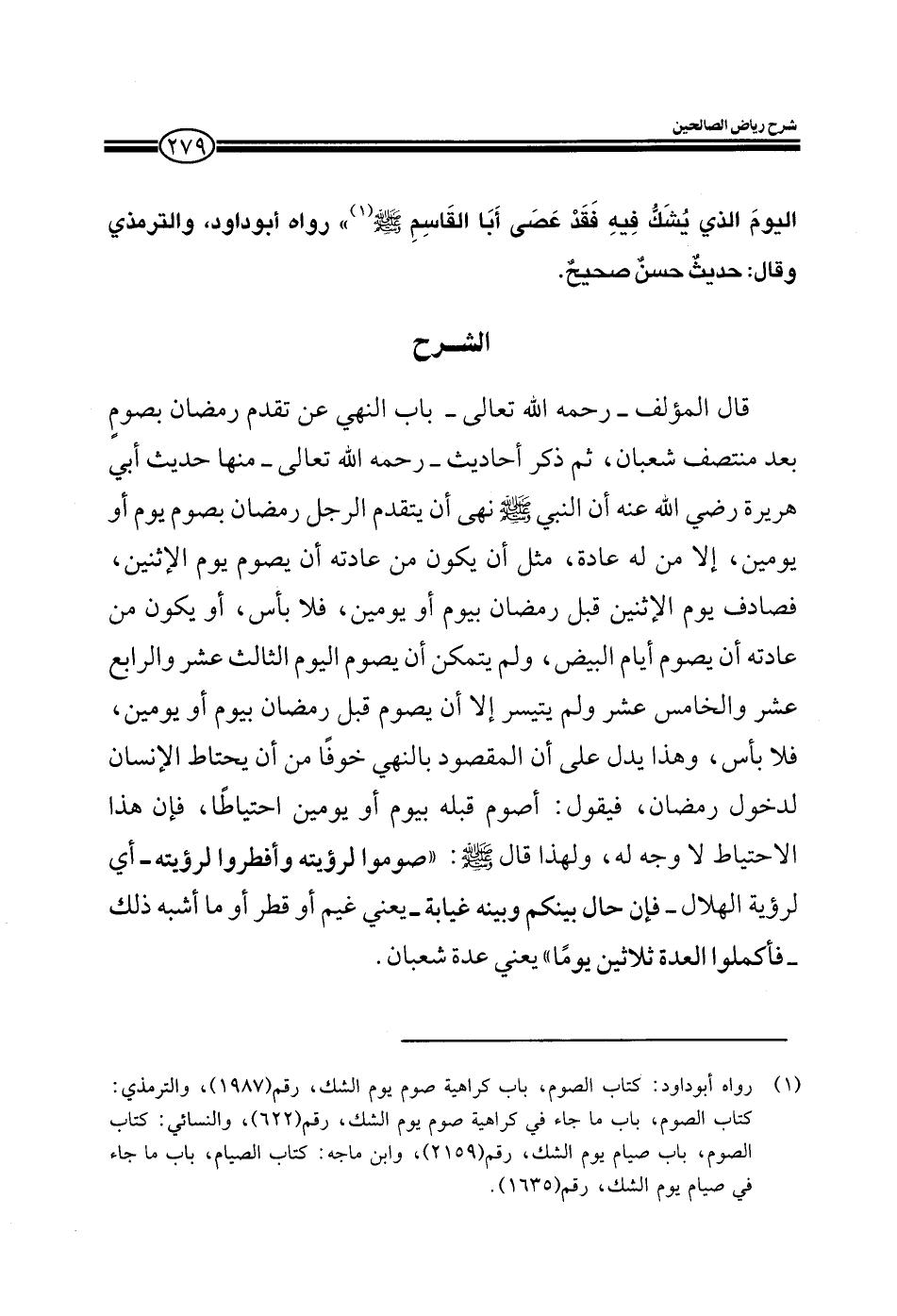 اليوم الذي يشك فيه فقد عصى أبا القاسم صلى الله عليه وسلم رواه أبو داود والترمذي وقال: حديث حسن صحيح..