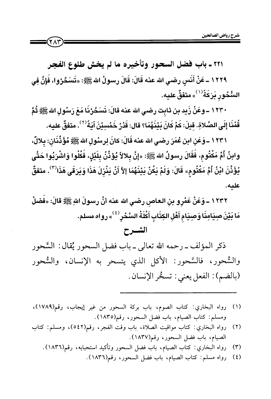 EXذكر المؤلف رحمه الله تعالى في كتابه رياض الصالحين باب فضل السحور يقال: السحور والسحور فالسحور الأكل الذي يتسحر به الإنسان والسحور بالضم الفعل يعني تسحر الإنسان.