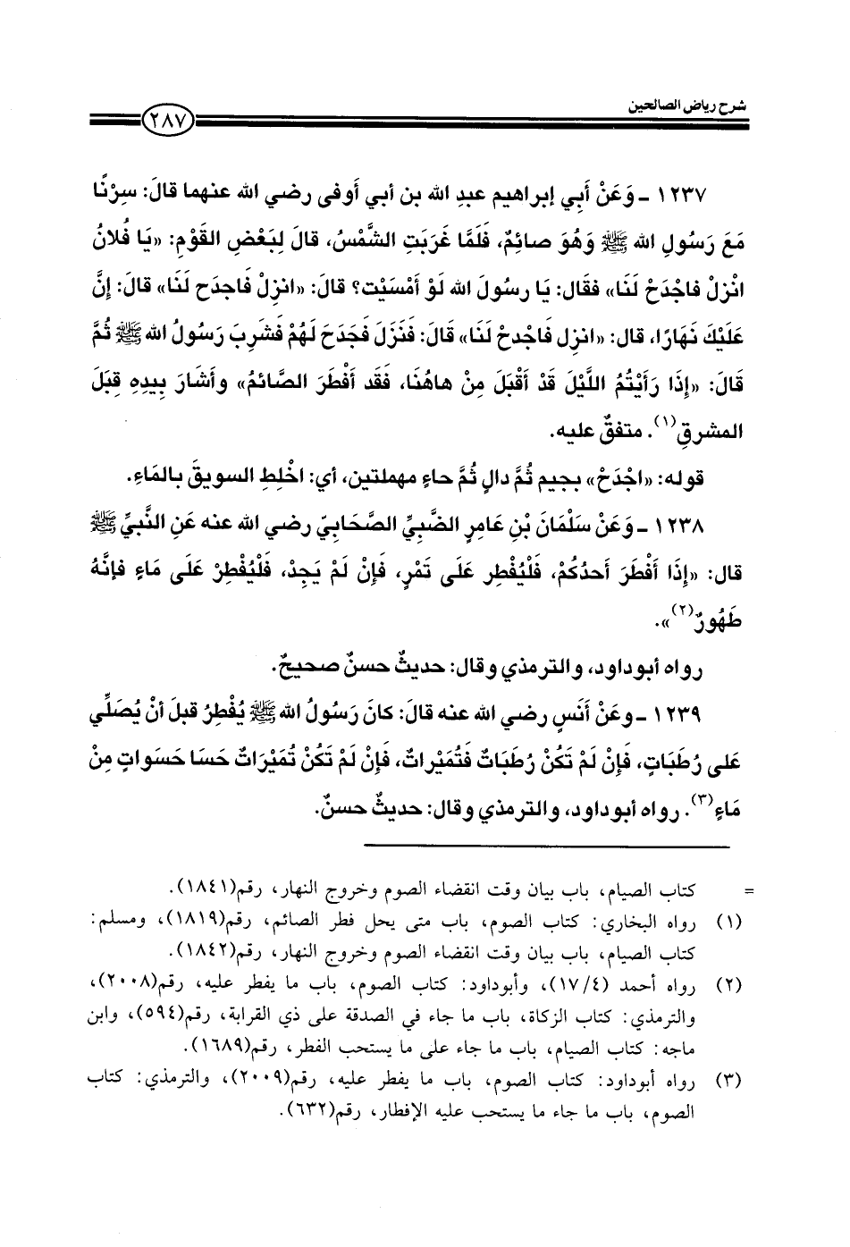 1238 - وعن سلمان بن عامر الضبي الصحابي رضي الله عنه عن النبي صلى الله عليه وسلم قال: إذا أفطر أحدكم، فليفطر على تمر، فإن لم يجد، فليفطر على ماء فإنه طهور رواه أبو داود والترمذي وقال: حديث حسن صحيح.