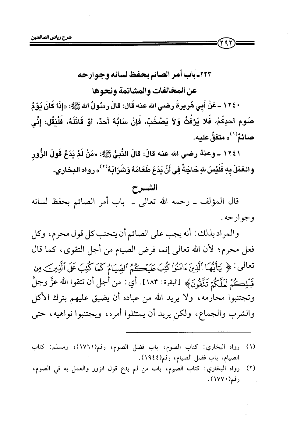 EXقال المؤلف رحمه الله تعالى في كتابه رياض الصالحين باب أمر الصائم بحفظ لسانه وجوارحه.