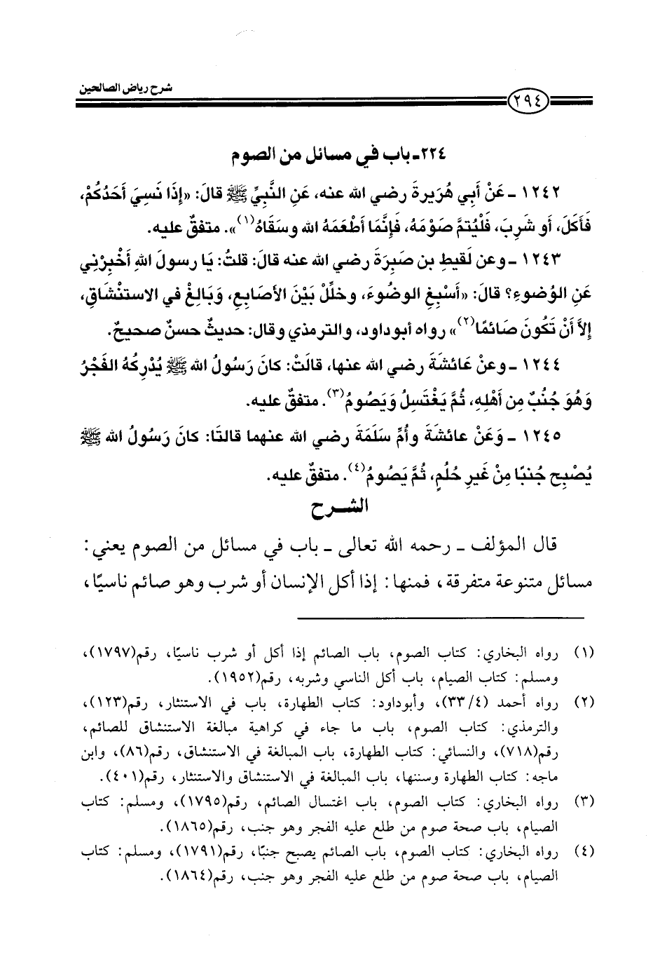 قال المؤلف رحمه الله في كتاب رياض الصالحين باب في مسائل من الصوم يعني مسائل متنوعة متفرقة فمنها إذا أكل الإنسان أو شرب وهو صائم ناسيا