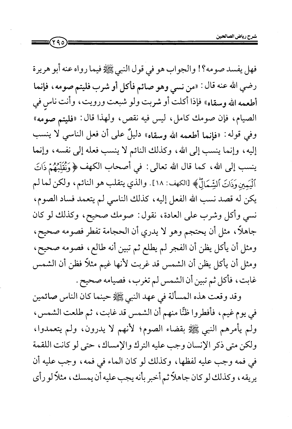 وقد وقعت هذه المسألة في عهد النبي صلى الله عليه وسلم حينما كان الناس صائمين في يوم غيم فأفطروا ظنا منهم أن الشمس قد غابت ثم طلعت الشمس ولم يأمرهم النبي صلى الله عليه وسلم بقضاء الصوم لأنهم لا يدرون ولم يتعمدوا ولكن متى ذكر الإنسان وجب عليه الترك والإمساك حتى لو كانت اللقمة في فمه وجب عليها لفظها وكذلك لو كان الماء في فمه وجب عليه أن يريقه وكذلك لو كان جاهلا ثم أخبر فإنه يجب عليه أن يمسك مثلا لو رأى