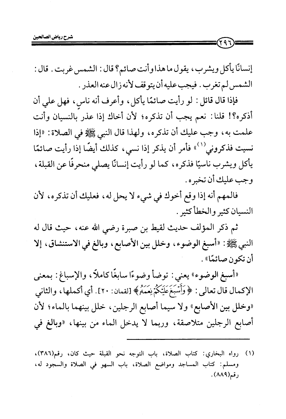 فإذا قال قائل لو رأيت صائما يأكل وأعرف أنه ناس فهل علي أن أذكره قلنا: نعم يجب أن تذكره لأن أخاك إذا عذر بالنسيان وأنت علمت به وجب عليك أن تذكره ولهذا قال النبي صلى الله عليه وسلم في الصلاة: (إذا نسيت فذكروني) فأمر أن يذكر إذا نسي كذلك أيضا إذا رأيت صائما يأكل ويشرب ناسيا فذكره كما لو رأيت إنسانا يصلي منحرفا عن القبلة وجب عليك أن تخبره.