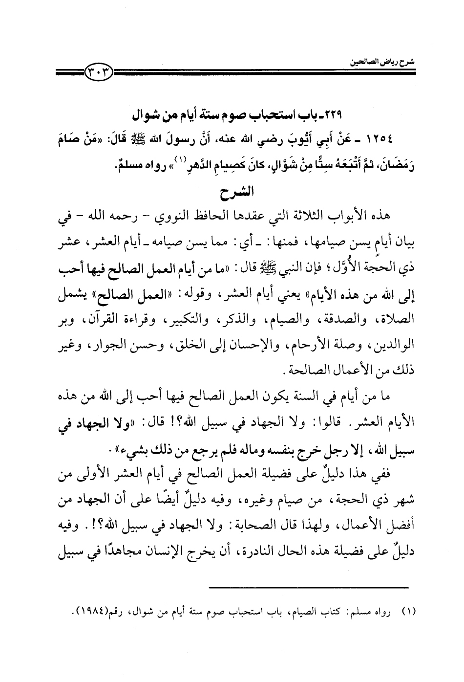 EXهذا الأبواب الثلاثة التي عقدها النووي في كتابه رياض الصالحين في بيان أيام يسن صيامها فمنها مما يسن صيامه أيام العشر عشر ذي الحجة الأول فأن النبي صلى الله عليه وسلم قال: ما من أيام العمل الصالح فيها أحب إلى الله من هذه الأيام يعني أيام العشر وقوله العمل الصالح يشمل الصلاة والصدقة والصيام والذكر والتكبير وقراءة القرآن وبر الوالدين وصلة الأرحام والإحسان إلى الخلق وحسن الجوار وغير ذلك ...