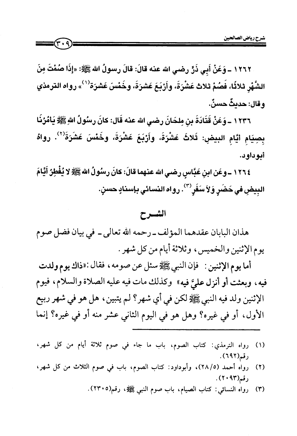 1262 - وعن أبي ذر رضي الله عنه قال: قال رسول الله صلى الله عليه وسلم: إذا صمت من الشهر ثلاثا فصم ثلاث عشرة وأربع عشرة وخمس عشرة رواه الترمذي وقال حديث حسن.