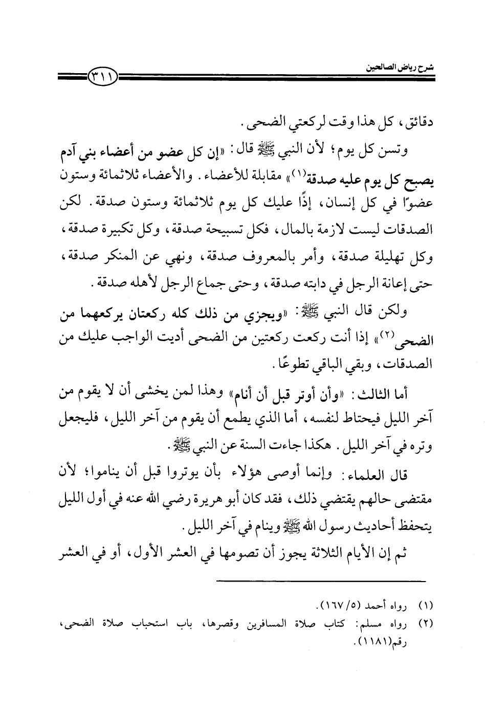 وتسن كل يوم لأن النبي صلى الله عليه وسلم قال: إن كل عضو من أعضاء بني آدم يصبح كل يوم عليه صدقة مقابلة للأعضاء والأعضاء ثلاثمائة وستون عضوا إذا عليك كل يوم ثلاثمائة وستون صدقة لكن الصدقات ما هي لازمة بالمال فكل تسبيحة صدقة وكل تكبيرة صدقة وكل تهليلة صدقة أمر بالمعروف صدقة نهي عن المنكر صدقة حتى إعانة الرجل في دابته صدقة حتى جماع الرجل لأهله صدقة.