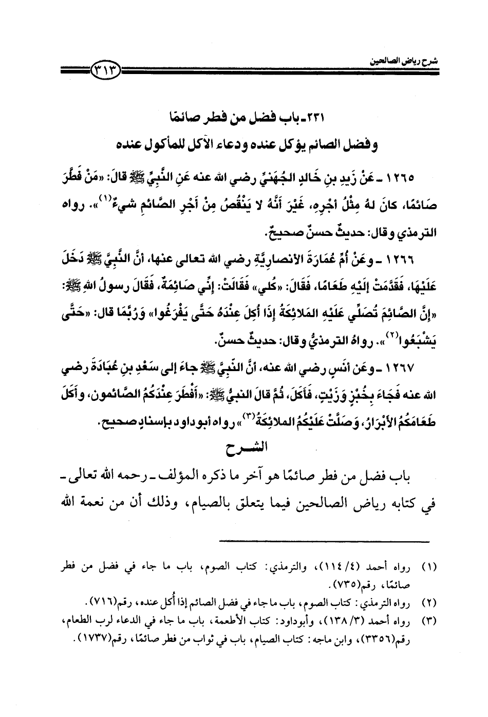 1266 - وعن أم عمارة الأنصارية رضي الله عنها أن النبي صلى الله عليه وسلم دخل عليها فقدمت إليه طعاما فقال: كلي فقالت إني صائمة فقال رسول الله صلى الله عليه وسلم: إن الصائم تصلي عليه الملائكة إذا أكل عنده حتى يفرغوا وربما قال: حتى يشبعوا رواه الترمذي وقال حديث حسن.
