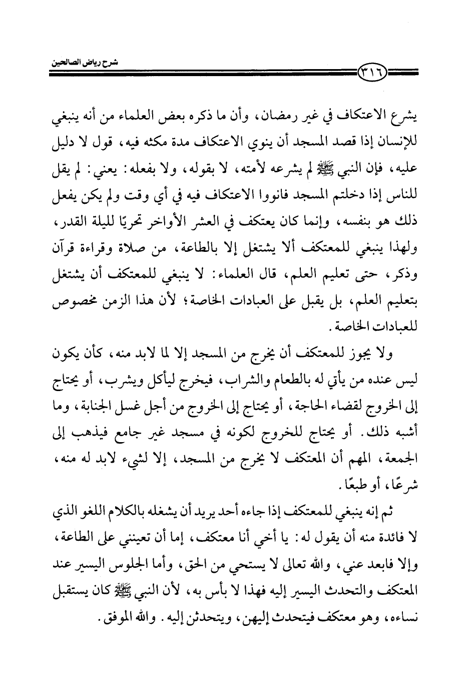 يشرع الاعتكاف في غير رمضان وأن ما ذكره بعض العلماء من أنه ينبغي للإنسان إذا قصد المسجد أن ينوي الاعتكاف مدة مكثه فيه قول لا دليل عليه فإن النبي صلى الله عليه وسلم لم يشرعه لأمته لا بقوله ولا بفعله يعني لم يقل للناس إذا دخلتم المسجد فأنووا الاعتكاف فيه في أي وقت ولم يكن يفعل ذلك هو بنفسه وإنما كان يعتكف العشر الأواخر تحريا لليلة القدر ولهذا ينبغي للمعتكف ألا يشتغل إلا بالطاعة من صلاة وقراءة القرآن وذكر وغير ذلك حتى تعليم العلم قال العلماء: لا ينبغي للمعتكف أن يشتغل بتعليم العلم بل يقبل على العبادات الخاصة لأن هذا الزمن مخصوص للعبادات الخاصة.