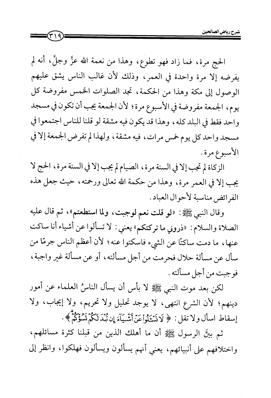 وقال النبي صلى الله عليه وسلم: لو قلت نعم لوجبت ولما استطعتم ثم قال عليه الصلاة والسلام ذروني ما تركتكم يعني: لا تسألوا عن أشياء أنا ساكت عنها ما دمت ساكت عن الشيء فاسكتوا عنه لأن أعظم الناس جرما من سأل عن مسألة حلال فحرمت من أجل مسألته أو عن مسألة غير واجبة فوجبت من أجل مسألته.