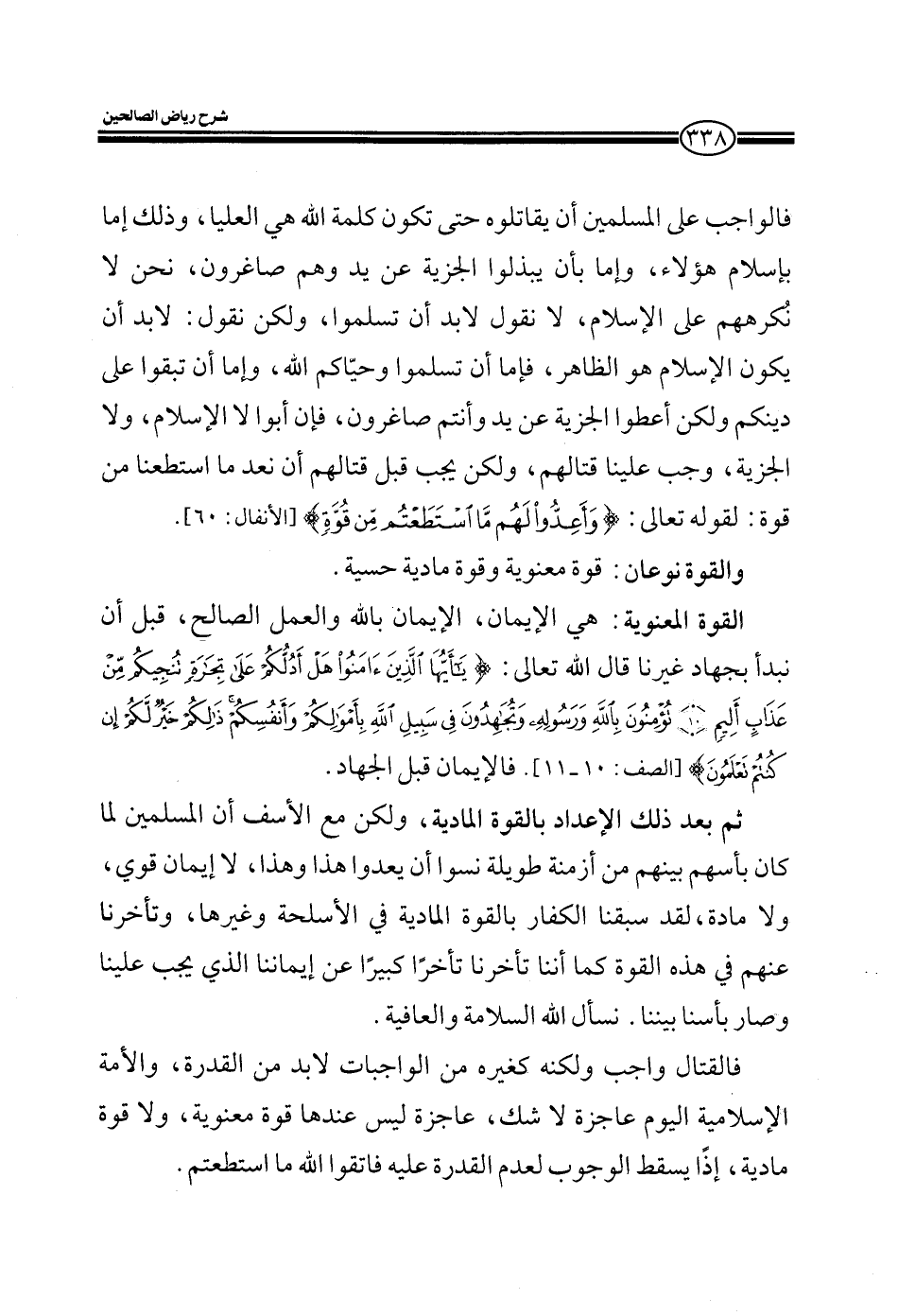 فالواجب على المسلمين أن يقاتلوه حتى تكون كلمة الله هي العليا وذلك إما بإسلام هؤلاء وإما بأن يبذلوا الجزية عن يد وهم صاغرون نحن لا نكرههم على الإسلام لا نقول لابد أن تسلموا ولكن نقول: لابد أن يكون الإسلام هو الظاهر فإما أن تسلموا وحياكم الله وإما أن تبقوا على دينكم ولكن أعطوا الجزية عن يد وأنتم صاغرون فإن أبوا لا الإسلام ولا الجزية وجب علينا قتالهم ولكن يجب قبل قتالهم أن نعد ما استطعنا من قوة لقوله تعالى: {وأعدوا لهم ما استطعتم من قوة} والقوة نوعان قوة معنوية وقوة مادية حسية القوة المعنوية الإيمان الإيمان بالله والعمل الصالح قبل أن نبدأ بجهاد غيرنا قال الله تعالى: {يا أيها الذين آمنوا هل أدلكم على تجارة تنجيكم من عذاب أليم تؤمنون بالله ورسوله وتجاهدون في سبيل الله بأموالكم وأنفسكم ذلكم خير لكم إن كنتم تعلمون فالإيمان قبل الجهاد ثم بعد ذلك الإعداد بالقوة المادية ولكن مع الأسف أن المسلمين لما كان بأسهم بينهم من أزمنة متطاولة نسوا أن يعدوا هذا وهذا لا إيمان قوي ولا مادة سبقنا الكفار بالقوة المادية بالأسلحة وغيرها وتأخرنا عنهم بهذه القوة كما أننا تأخرنا عن إيماننا الذي يجب علينا تأخرا كبيرا وسار بأسنا بيننا نسأل الله السلامة والعافية.