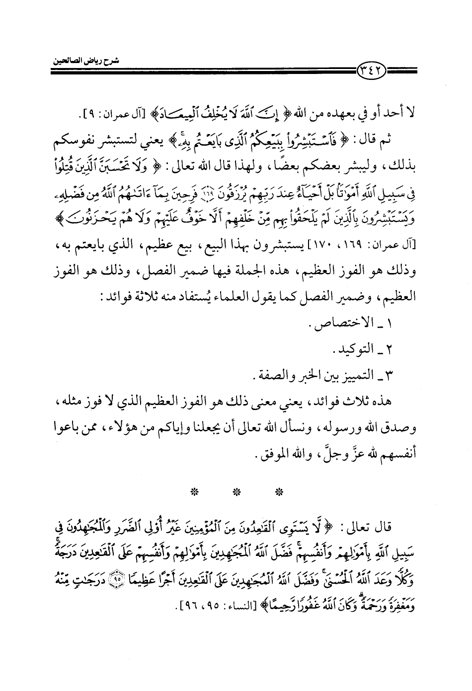 وضمير الفصل يقول العلماء يستفاد منه ثلاث فوائد: 1 - الاختصاص 2 - التوفيق 3 - التمييز بين الخبر والصفة يعني معنى ذلك هو الفوز العظيم الذي لا فوز مثله وصدق الله ورسوله ونسأل الله تعالى أن يجعلنا من هؤلاء ممن باعوا أنفسهم لله عز وجل والله الموفق.