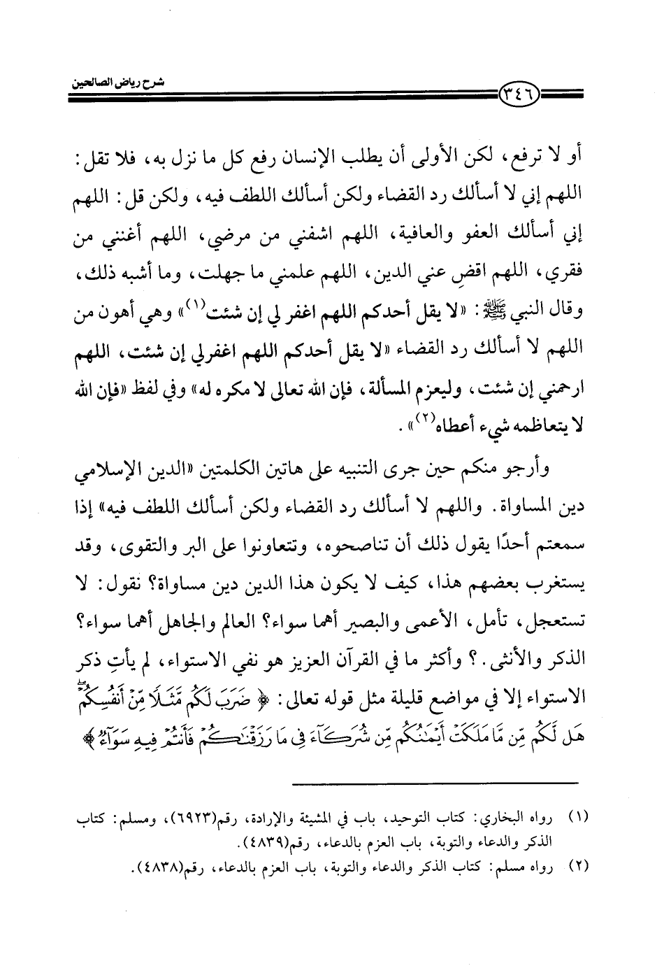 وأرجو منكم حين جرى التنبيه على هاتين الكلمتين الدين الإسلامي دين المساواة واللهم لا أسألك رد القضاء ولكن أسألك اللطف فيه إذا سمعتم أحدا يقول ذلك أن تنبهوه وتتعاونوا على البر والتقوى وأكثر ما في القرآن العزيز هو نفي الاستواء لم يأت ذكر الاستواء إلا في مواطن قليلة مثل قوله تعالى: {ضرب لكم مثلا من أنفسكم هل لكم من ما ملكت أيمانكم من شركاء في ما رزقناكم فأنتم فيه سواء}