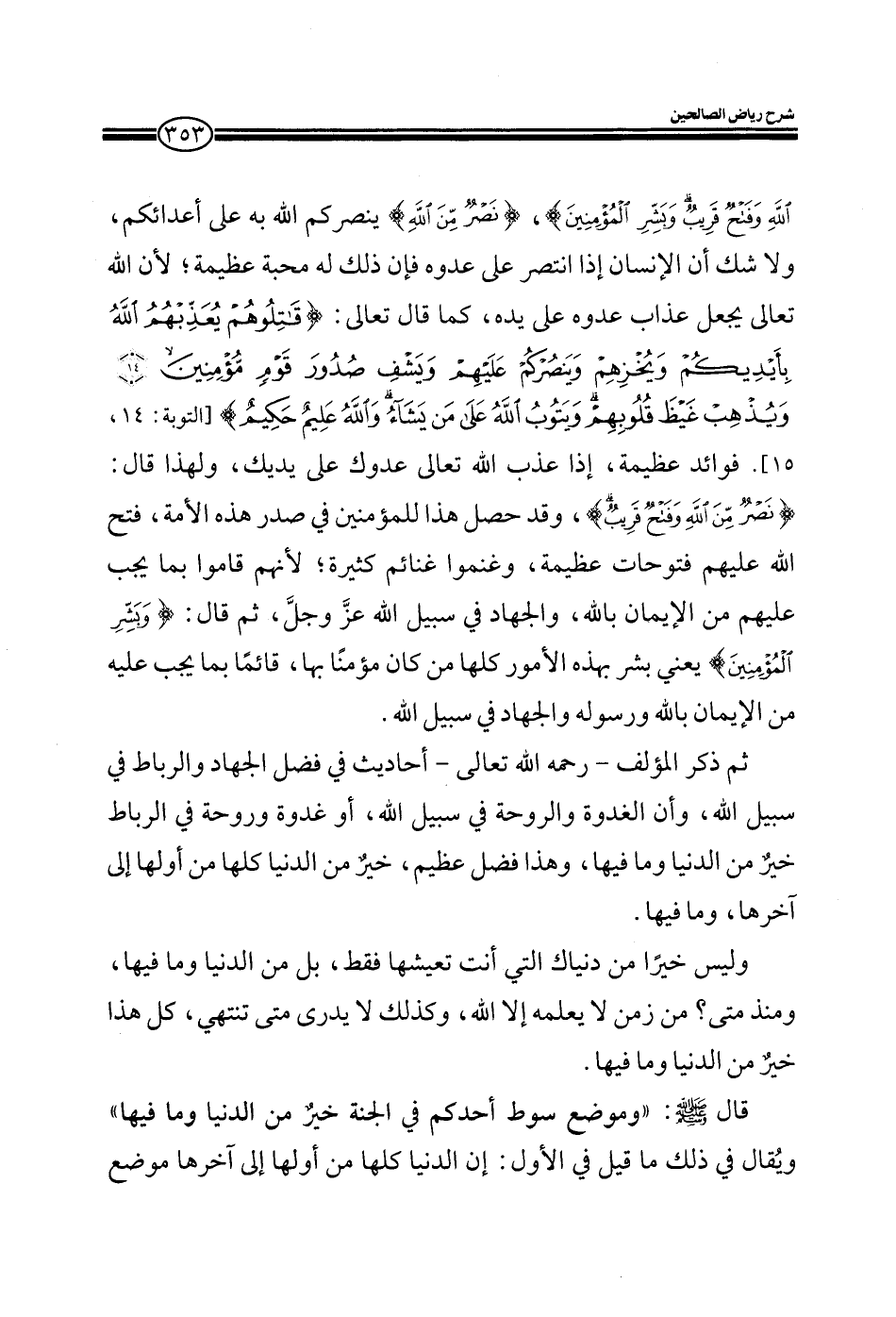 ثم ذكر المؤلف رحمه الله أحاديث في فضل الجهاد والرباط في سبيل الله وأن الغدوة والروحة في سبيل الله أو غدوة وروحة في الرباط خير من الدنيا وما فيها وهذا فضل عظيم خير من الدنيا كلها من أولها إلى آخرها وما فيها.