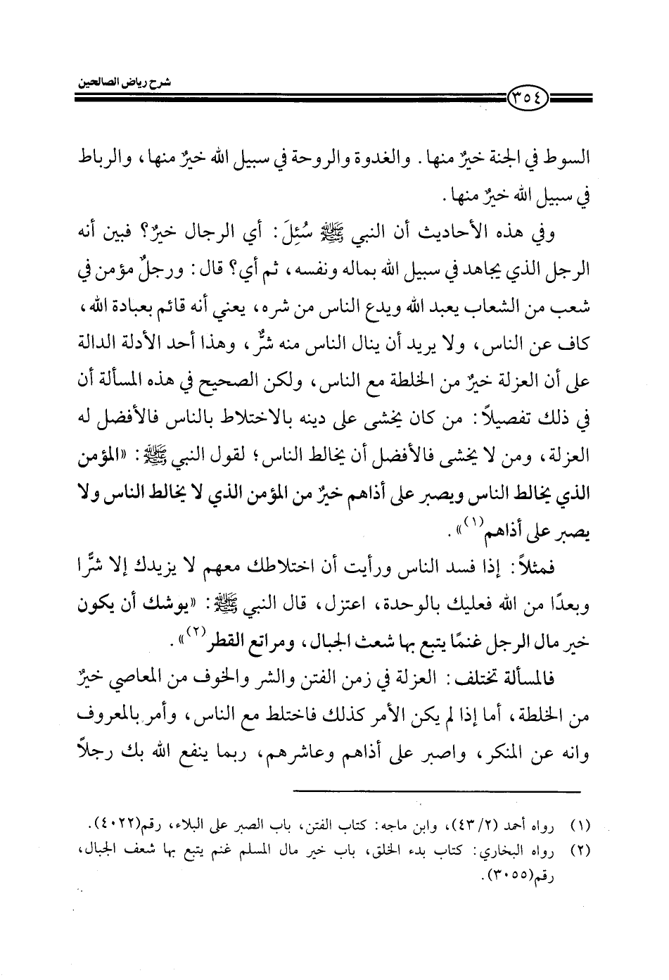 وفي هذه الأحاديث أن النبي صلى الله عليه وسلم سأل أي الرجال خير فبين أنه الرجل الذي يجاهد في سبيل الله بماله ونفسه ثم أي قال ورجل مؤمن في شعب من الشعاب يعبد الله ويدع الناس من شره يعني أنه قائم بعبادة الله كاف عن الناس ولا يريد أن ينال الناس منه شر وهذا أحد الأدلة الدالة على أن العزلة خير من الخلطة مع الناس ولكن الصحيح في هذه المسألة أن في ذلك تفصيلا من كان يخشى على دينه بالاختلاط بالناس فالأفضل له العزلة ومن لا يخشى فالأفضل أن يخالط الناس لقول النبي صلى الله عليه وسلم: المؤمن الذي يخالط الناس ويصبر على آذاهم خير من المؤمن الذي لا يخالط الناس ولا يصبر على آذاهم.