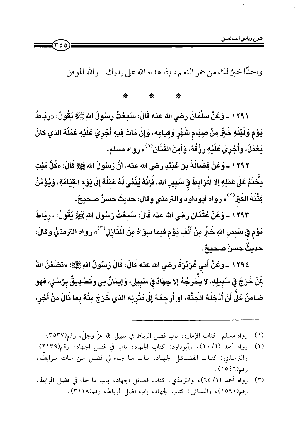 1293 - وعن عثمان رضي الله عنه قال سمعت رسول الله صلى الله عليه وسلم يقول: رباط يوم & في سبيل الله خير من ألف يوم فيما سواه من المنازل رواه الترمذي وقال: حديث حسن صحيح.