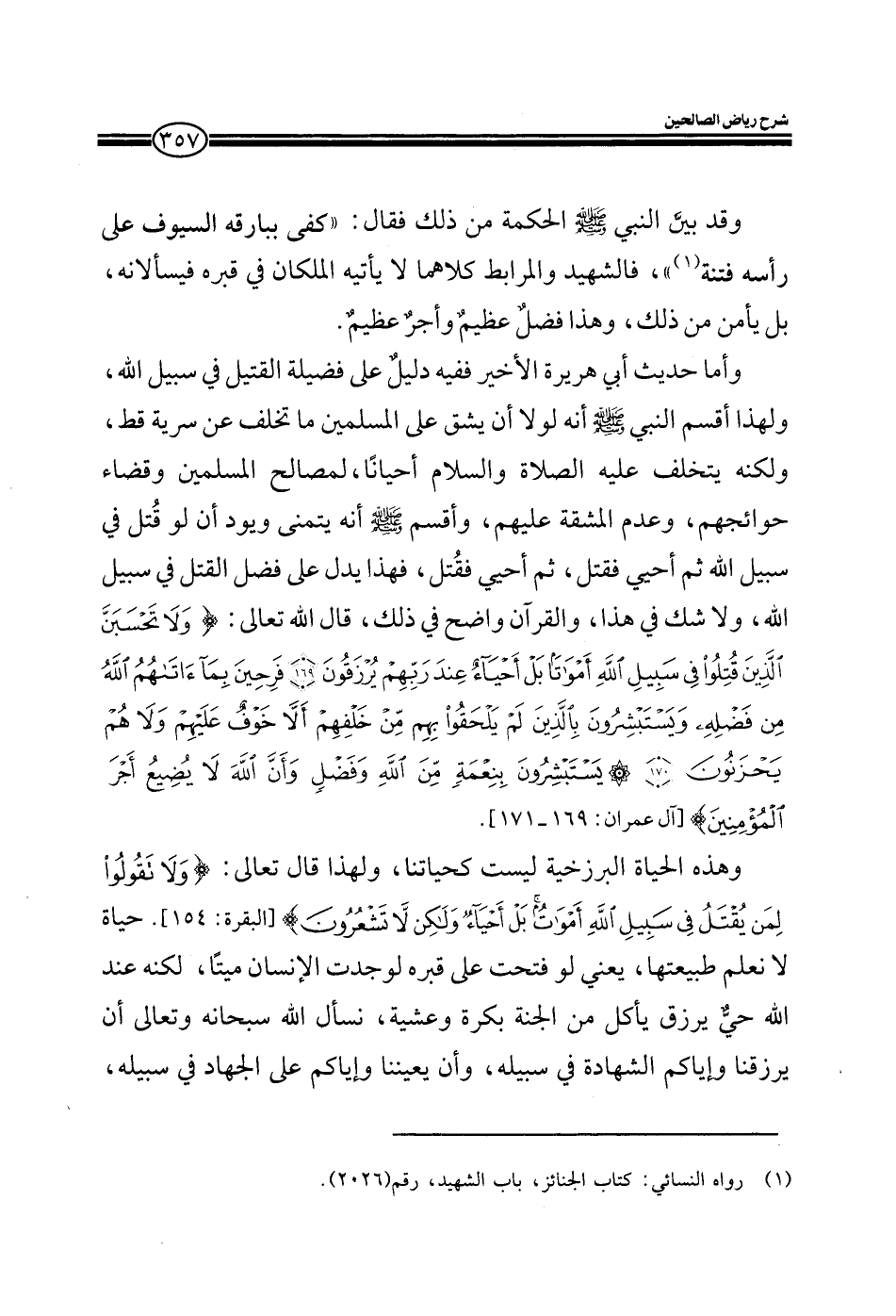 وأما حديث أبي هريرة الأخير ففيه دليل على فضيلة القتيل في سبيل الله ولهذا أقسم النبي صلى الله عليه وسلم أنه لولا أن يشق على المسلمين ما تخلف عن سرية قط ولكنه يتخلف عليه الصلاة والسلام أحيانا لأشغال المسلمين وقضاء حوائجهم وعدم المشقة عليهم وأقسم صلى الله عليه وسلم أنه يتمنى ويود أن لو قتل في سبيل الله ثم أحيي فقتل ثم أحيي فقتل فهذا يدل على فضل القتل في سبيل الله ولا شك في هذا والقرآن واضح في ذلك قال الله تعالى: ولا تحسبن الذين قتلوا في سبيل الله أمواتا بل أحياء عند ربهم يرزقون فرحين بما آتاهم الله من فضله ويستبشرون بالذين لم يلحقوا بهم من خلفهم ألا خوف عليهم ولا هم يحزنون يستبشرون بنعمة من الله وفضل وأن الله لا يضيع أجر المؤمنين وهذه الحياة البرزخية لا نعلم بها وليست كحياتنا ولهذا قال تعالى: {ولا تقولوا لمن يقتل في سبيل الله أموات بل أحياء ولكن لا تشعرون} .
