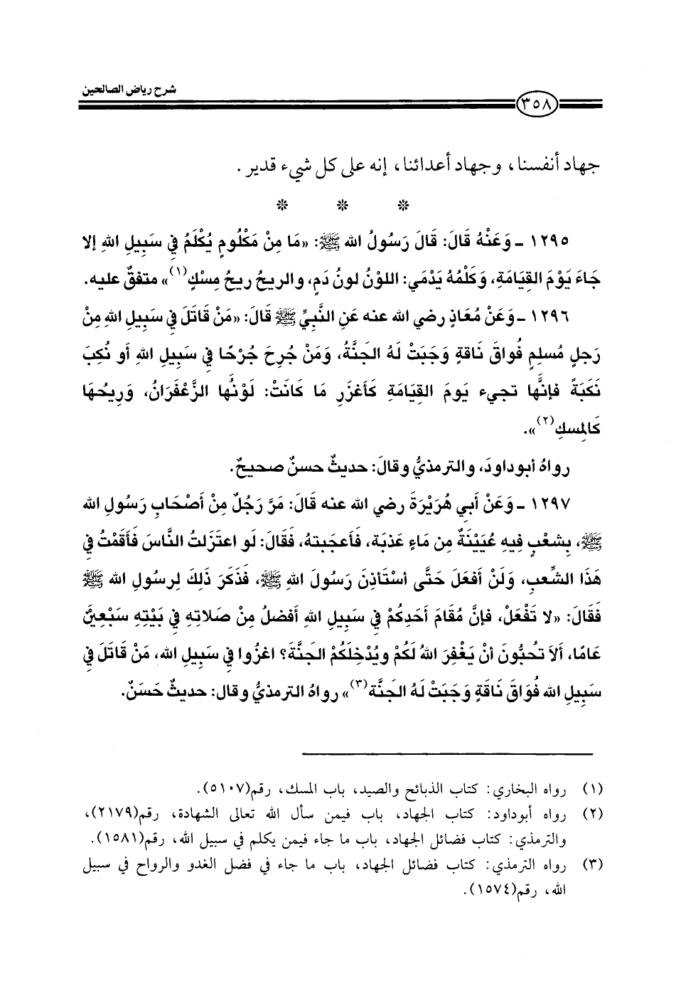 1296 - وعن معاذ رضي الله عنه عن النبي صلى الله عليه وسلم قال: من قاتل في سبيل الله من رجل مسلم فواق ناقة وجبت له الجنة ومن جرح جرحا في سبيل الله أو نكب نكبة فإنها تجيء يوم القيامة كأغزر ما كانت لونها الزعفران وريحها كالمسك رواه أبو داود والترمذي وقال: حديث حسن صحيح.