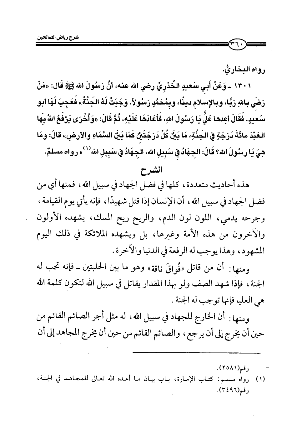 1301 - وعن أبي سعيد الخدري رضي الله عنه أن رسول الله صلى الله عليه وسلم قال من رضي بالله ربا وبالإسلام دينا وبمحمد رسولا وجبت له الجنة فعجب لها أبو سعيد فقال أعدها علي يا رسول الله فأعادها عليه ثم قال: وأخرى يرفع الله بها العبد مائة درجة في الجنة ما بين كل درجتين كما بين السماء والأرض قال: وما هي يا رسول الله قال الجهاد في سبيل الله الجهاد في سبيل الله رواه مسلم.