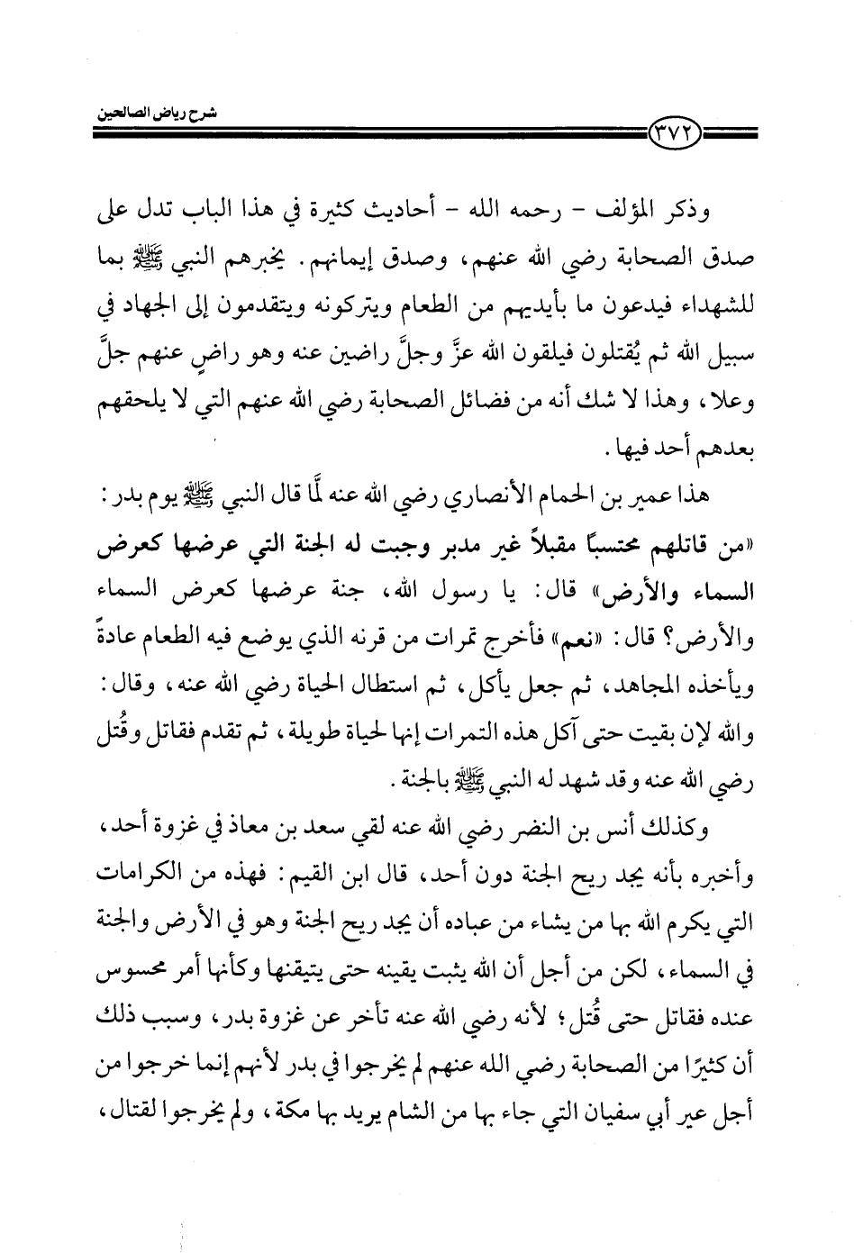 هذا عمير بن الحمام الأنصاري رضي الله عنه لما قال النبي صلى الله عليه وسلم يوم بدر: من قاتلهم محتسبا مقبلا غير مدبر وجبت له جنة عرضها كعرض السماء والأرض قال: يا رسول الله جنة عرضها كعرض السماء والأرض قال: نعم فأخرج تمرات من قرنه الذي يوضع فيه الطعام عادة ويأخذه المجاهد ثم جعل يأكل ثم استطال الحياة رضي الله عنه وقال: والله لأن بقيت حتى آكل هذه التمرات إنها لحياة طويلة ثم تقدم فقاتل وقتل رضي الله عنه وقد شهد له النبي صلى الله عليه وسلم بالجنة.