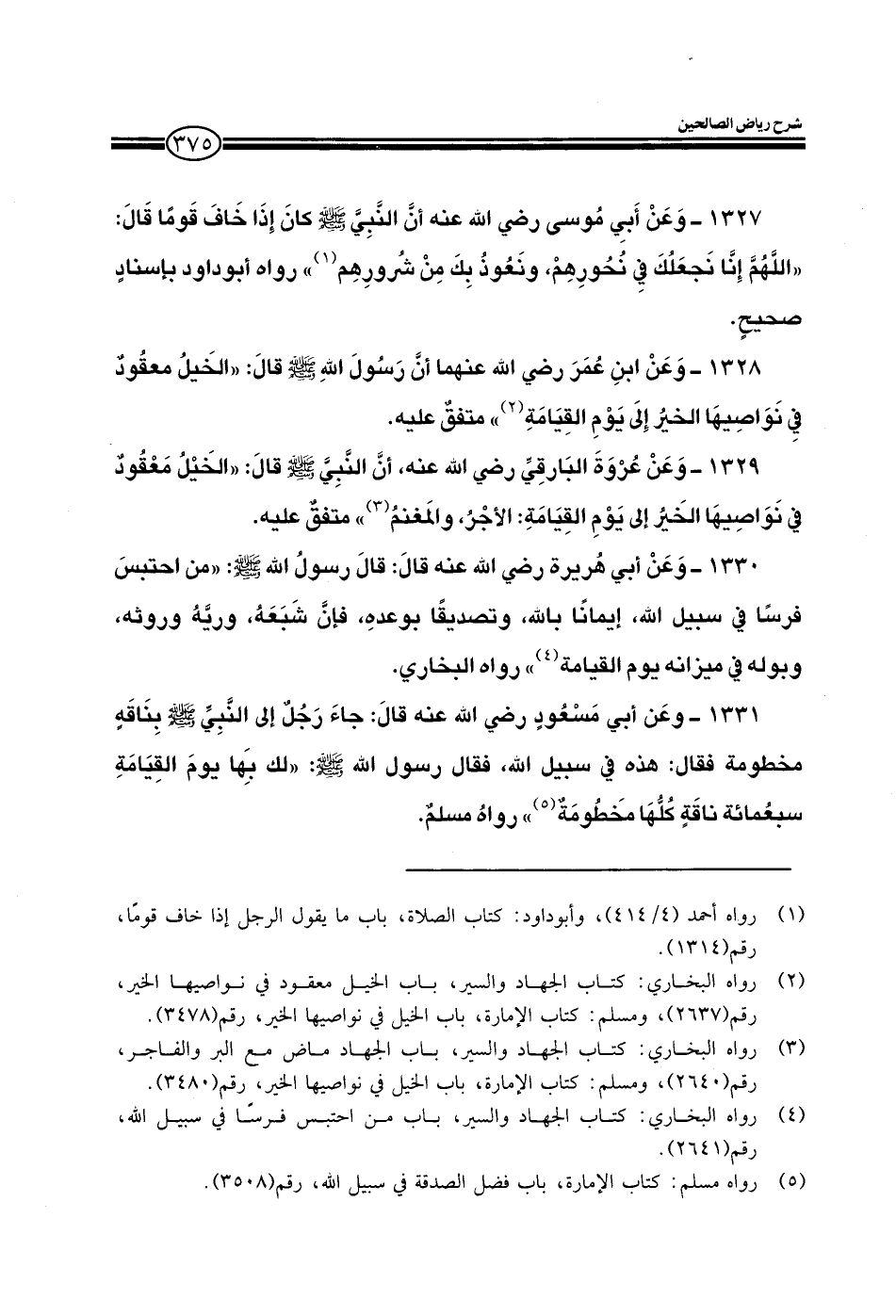 1331 - وعن أبي مسعود رضي الله عنه قال جاء رجل إلى النبي صلى الله عليه وسلم بناقة مخطومة فقال: هذه في سبيل الله فقال رسول الله صلى الله عليه وسلم: لك بها يوم القيامة سبعمائة ناقة كلها مخطومة رواه مسلم.