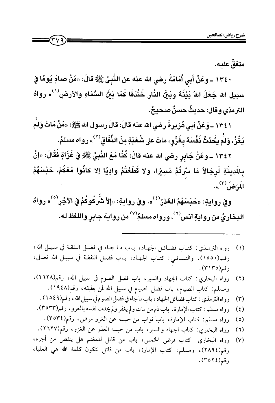 1340 - وعن أبي أمامة رضي الله عنه عن النبي صلى الله عليه وسلم قال من صام يوما في سبيل الله جعل الله بينه وبين النار خندقا كما بين السماء والأرض رواه الترمذي وقال: حديث حسن صحيح.