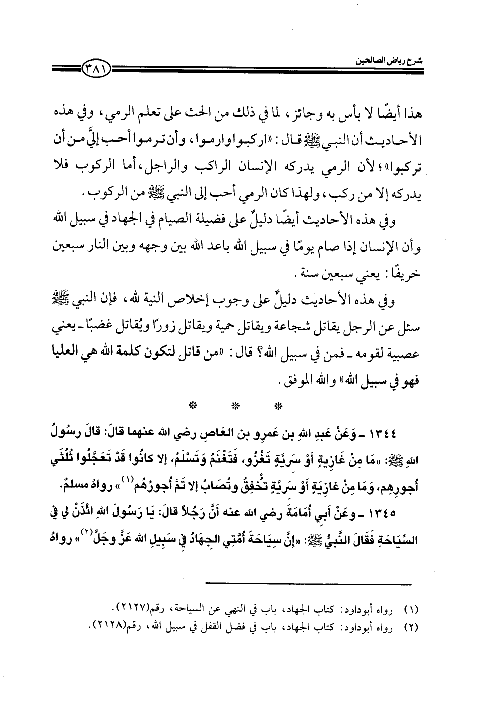 1345 - وعن أبي أمامة رضي الله عنه أن رجلا قال: يا رسول الله ائذن لي في السياحة فقال النبي صلى الله عليه وسلم: إن سياحة أمتي الجهاد في سبيل الله عز وجل رواه