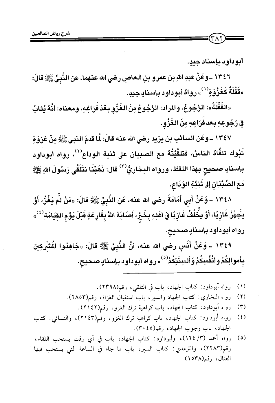 1346 - وعن عبد الله بن عمرو بن العاص رضي الله عنهما عن النبي صلى الله عليه وسلم قال: قفلة كغزوة رواه أبو داود بإسناد جيد.