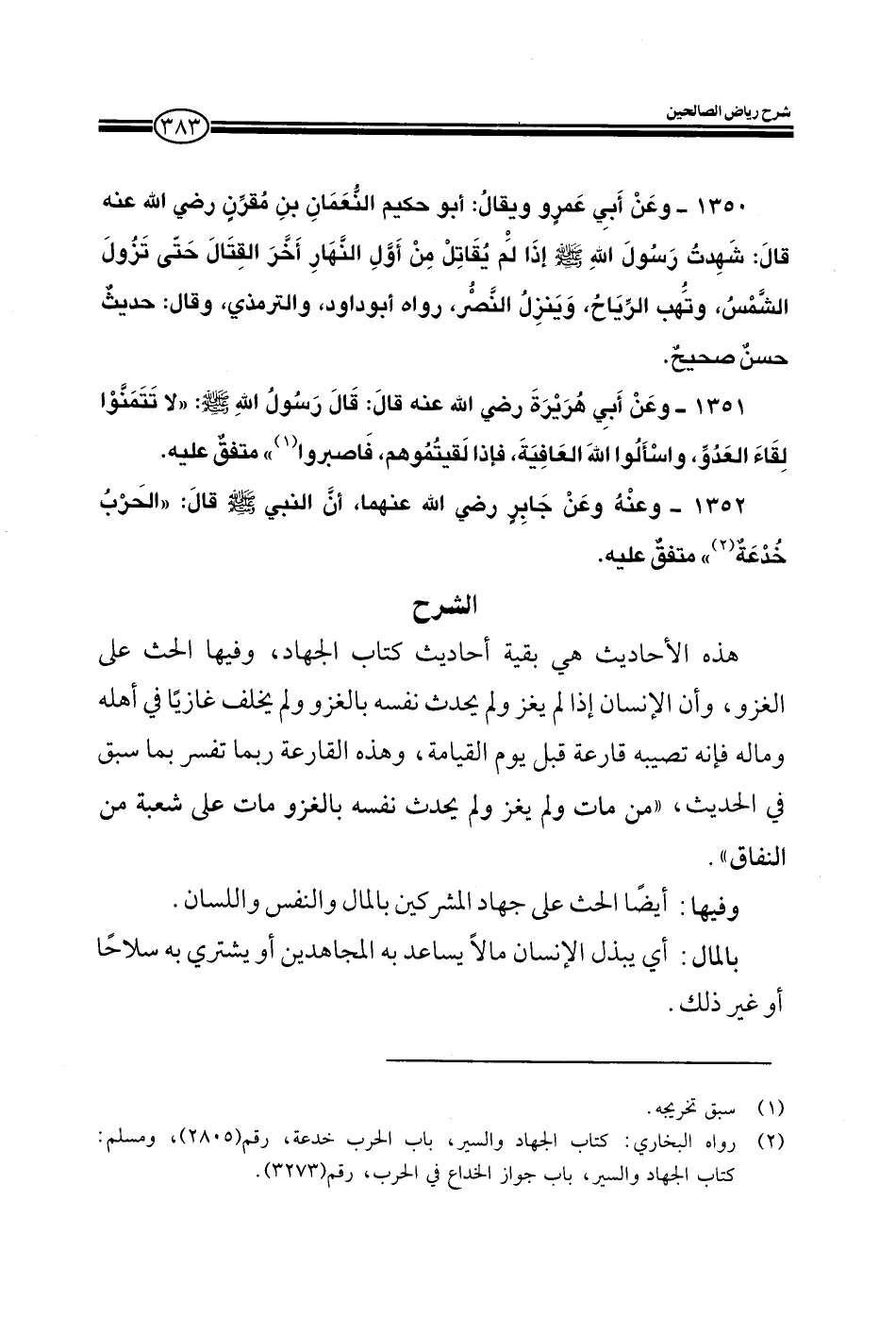 EXهذه الأحاديث هي بقية أحاديث باب الجهاد المنقولة في كتاب رياض الصالحين وفيها الحث على الغزو وأن الإنسان إذا لم يغز ولم يحدث نفسه بالغزو ولم يخلف غازيا في أهله وماله فإنه تصيبه قارعة قبل يوم القيامة وهذه القارعة ربما تفسر بما سبق في الحديث من مات ولم يغز ولم يحدث نفسه بالغزو مات على شعبة من النفاق وفيها أيضا الحث على جهاد المشركين بالمال والنفس واللسان بالمال: أي يبذل الإنسان مالا يساعد به المجاهدين أو يشتري به سلاحا أو غير ذلك