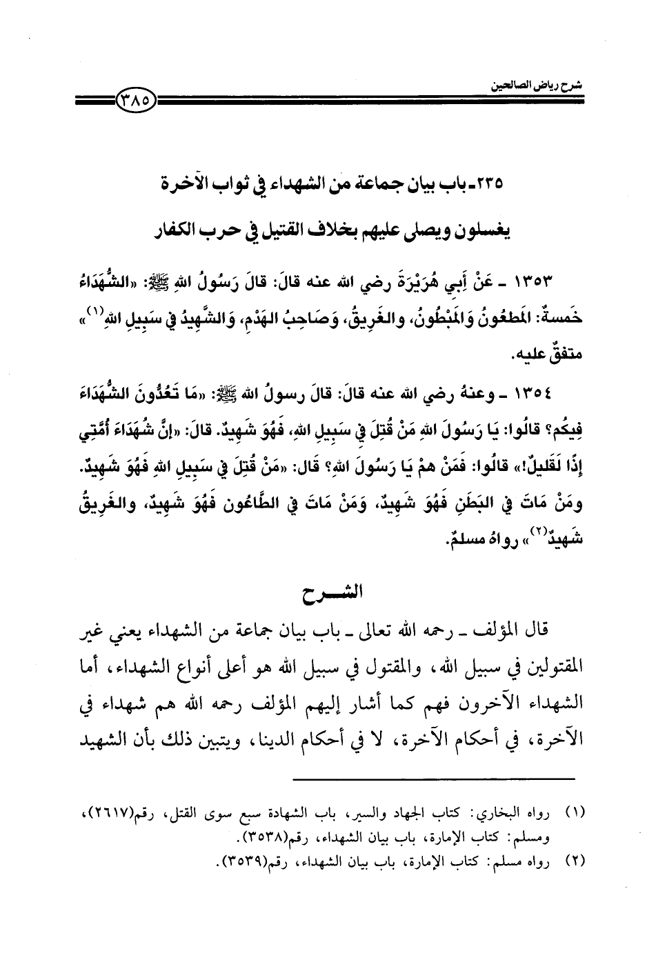 EXقال المؤلف رحمه الله في كتاب رياض الصالحين باب بيان شيء من الشهداء يعني غير المقتولين في سبيل الله والمقتول في سبيل الله هو أعلى أنواع الشهداء أما الشهداء الآخرون فهم كما أشار إليهم المؤلف هم شهداء في الآخرة في أحكام الآخرة لا في أحكام الدنيا ويتبين ذلك بأن الشهيد