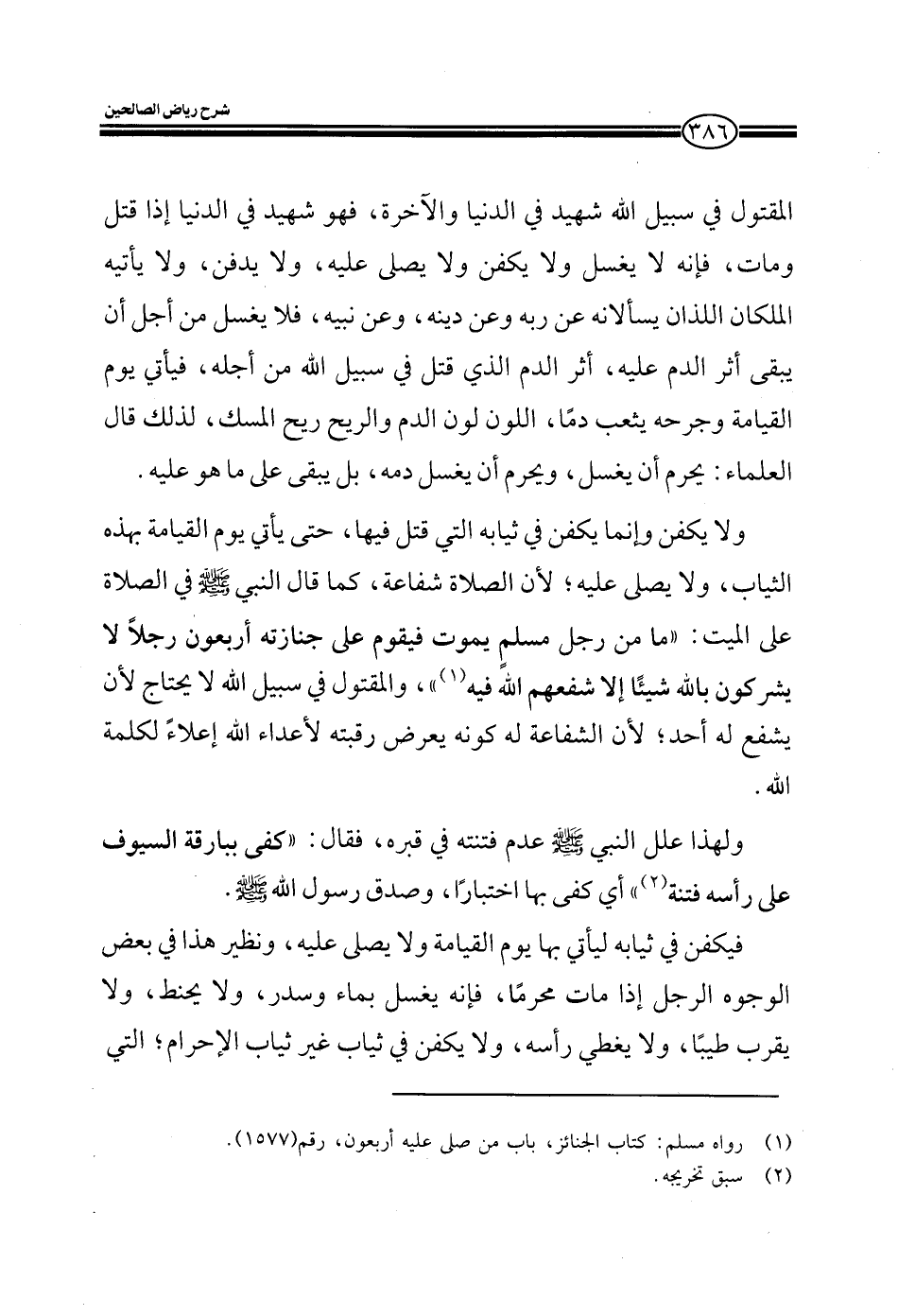 ولا يكفن وإنما يكفن في ثيابه التي قتل فيها حتى يأتي يوم القيامة بهذه الثياب ولا يصلى عليه لأن الصلاة شفاعة كما قال النبي صلى الله عليه وسلم في الصلاة على الميت: ما من رجل مسلم يموت فيقوم على جنازته أربعون رجلا لا يشركون بالله شيئا إلا شفعهم الله فيه والمقتول في سبيل الله لا يحتاج لأن يشفع له أحد لأن الشفاعة له كونه يعرض رقبته لأعداء الله إعلاء لكلمة الله.