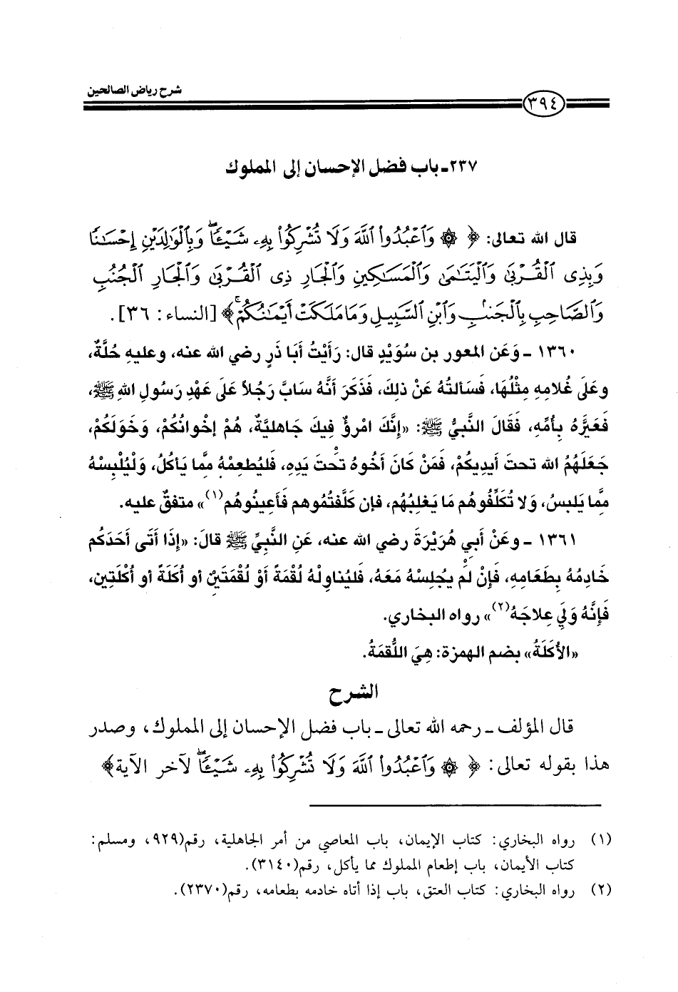 1360 - وعن المعرور بن سويد قال: رأيت أبا ذر رضي الله عنه وعليه حلة وعلى غلامه مثلها فسألته عن ذلك فذكر أنه ساب رجلا على عهد رسول الله صلى الله عليه وسلم فعيره بأمه فقال النبي صلى الله عليه وسلم إنك امرؤ فيك جاهلية هم إخوانكم وخولكم جعلهم الله تحت أيديكم فمن كان أخوه تحت يده فليطعمه مما يأكل وليلبسه مما يلبس ولا تكلفوهم ما يغلبهم فإن كلفتموهم فأعينوهم متفق عليه.