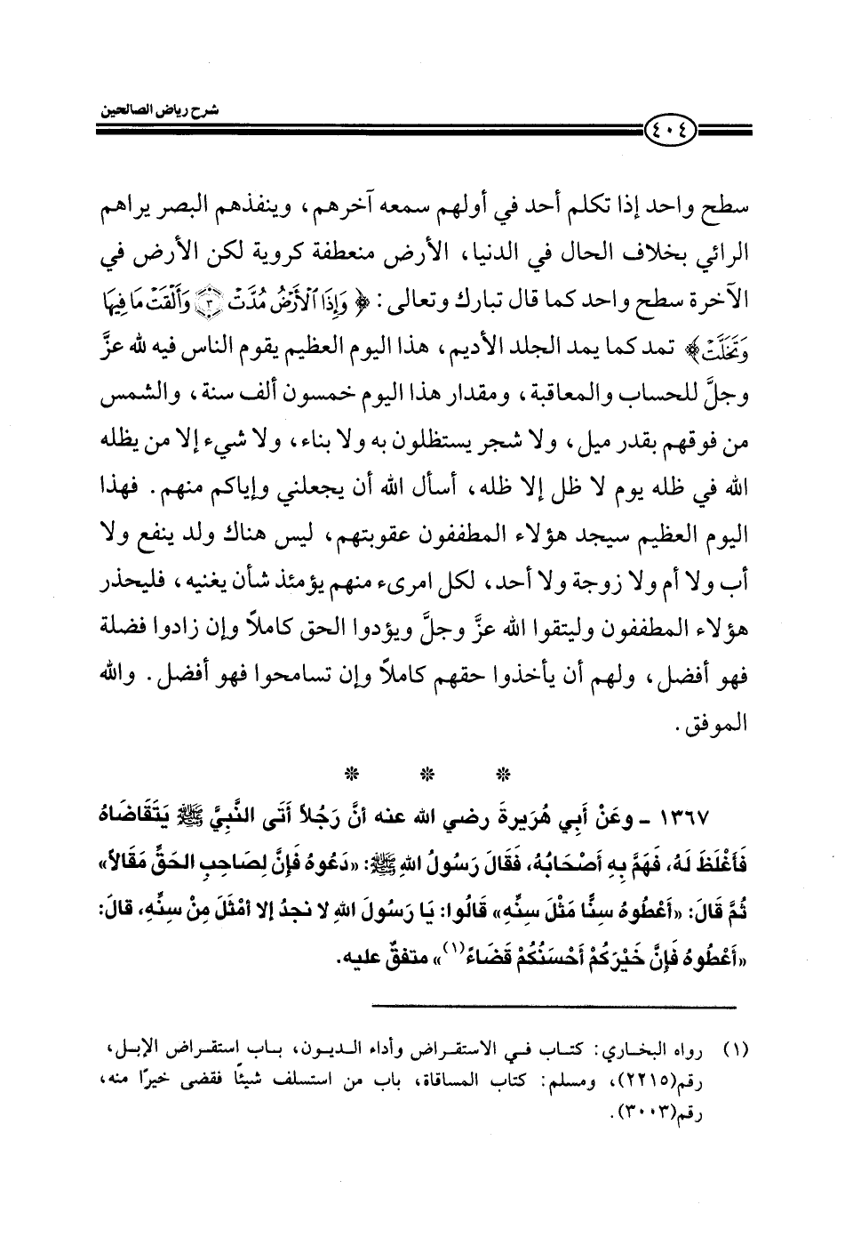 1367 - وعن أبي هريرة رضي الله عنه أن رجلا أتى النبي صلى الله عليه وسلم يتقاضاه فأغلظ له فهم به أصحابه فقال رسول الله صلى الله عليه وسلم: دعوه فإن لصاحب الحق مقالا ثم قال: أعطوه سنا مثل سنه قالوا: يا رسول الله لا نجد إلا أمثل من سنه قال: أعطوه فإن خيركم أحسنكم قضاء متفق عليه.