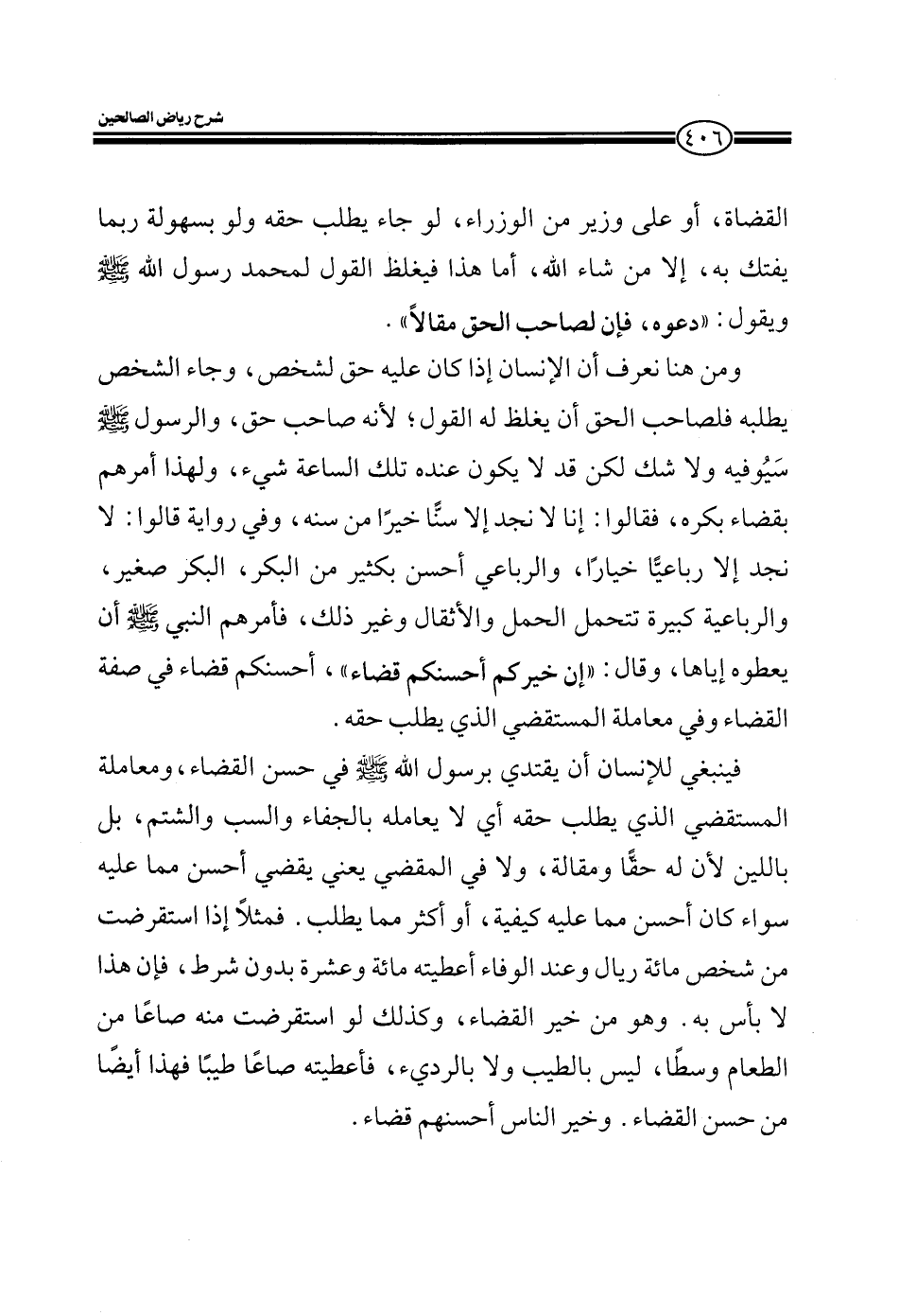 القضاة أو على وزير من الوزراء لو جاء يطلب حقه ولو بسهولة ربما يفتك به إلا من شاء الله هذا يغلظ القول لمحمد رسول الله صلى الله عليه وسلم ويقول: دعوه فإن لصاحب الحق مقالا ومن هنا نعرف أن الإنسان إذا كان عليه حق لشخص وكان الشخص جاء يطلبه فلصاحب الحق أن يغلظ له القول لأنه صاحب حق والرسول صلى الله عليه وسلم سيوفيه لا شك لكن قد لا يكون عنده تلك الساعة شيء ولذلك أمرهم بقضاء بكره فقالوا: إنا لا نجد إلا سنا خيرا من سنة وفي رواية قالوا: لا نجد إلا رباعيا خيارا والرباعي أحسن بكثير من البكر البكر صغير والرباعية كبيرة تتحمل الحمل والأثقال وغير ذلك فأمرهم النبي صلى الله عليه وسلم أن يعطوه إياها وقال: إن خيركم أحسنكم قضاء في صفة القضاء وفي معاملة المستقضي الذي يطلب حقه فينبغي للإنسان أن يقتدي برسول الله صلى الله عليه وسلم في حسن القضاء لكن معاملة المستقضي الذي يطلب حقه أي لا يعامله بالجفاء والسب والشتم بل باللين لأن له حقا ومقالة ولا في المقضي يعني يقضي أحسن مما عليه سواء كان أحسن مما عليه كيفية أو أكثر مما يطلب فمثلا إذا استقرضت من شخص مائة ريال وعند الوفاء أعطيته مائة وعشرة بدون شرط فإن هذا لا بأس به وهو من خير القضاء وكذلك لو استقرضت منه صاعا من الطعام وسطا ليس بالطيب ولا بالرديء فأعطيته صاعا طيبا فهذا أيضا من حسن القضاء وخير الناس أحسنهم قضاء