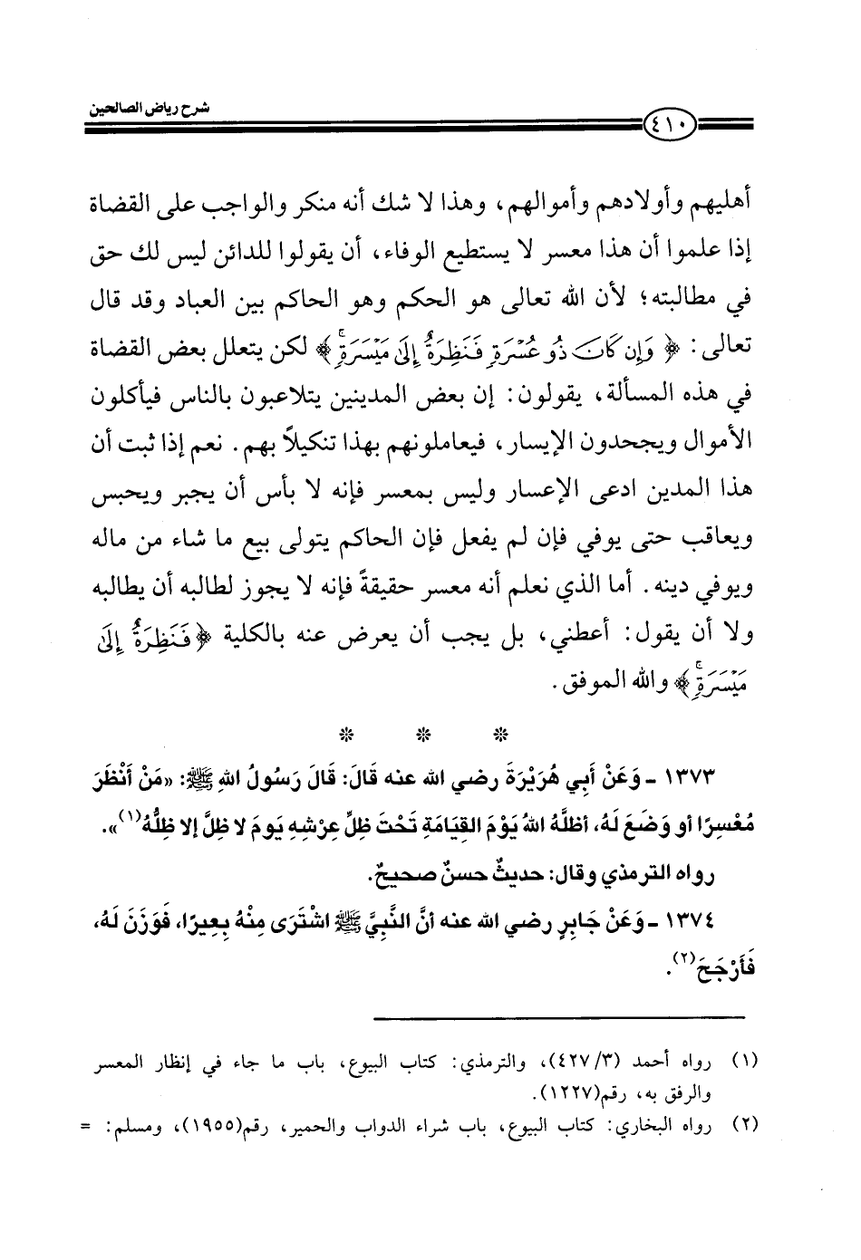 1373 - وعن أبي هريرة رضي الله عنه قال: قال رسول الله صلى الله عليه وسلم: من أنظر معسرا أو وضع له أظله الله يوم القيامة تحت ظل عرشه يوم لا ظل إلا ظله رواه الترمذي وقال حديث حسن صحيح.