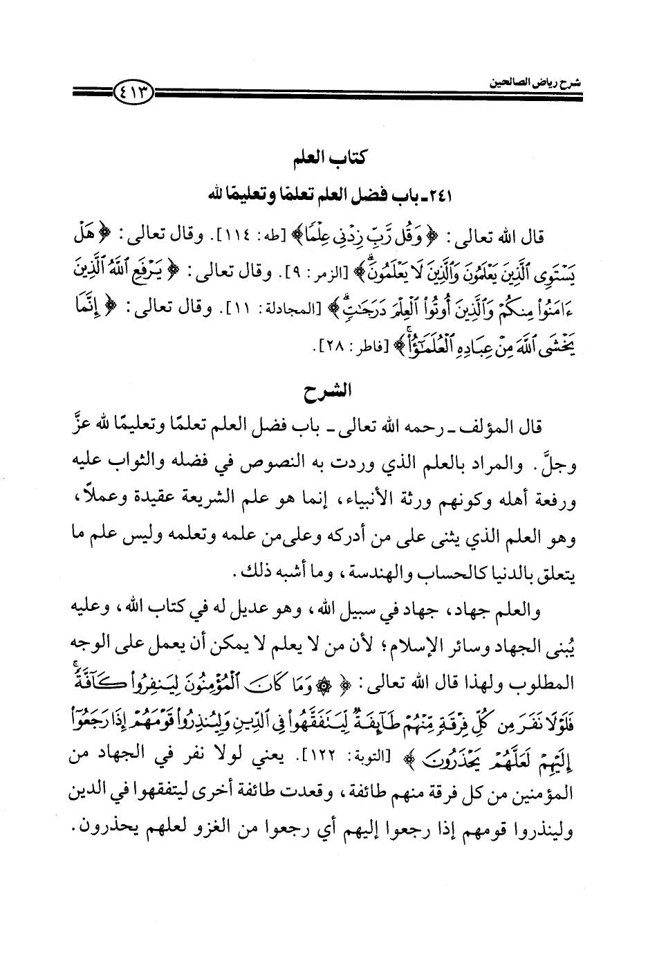 EXقال المؤلف النووي في كتابه رياض الصالحين باب فضل العلم تعلما وتعليما لله عز وجل والمراد بالعلم الذي وردت به النصوص في فضله والثواب عليه ورفعه أهله وكونهم ورثة الأنبياء إنما هو علم الشريعة عقيدة وعملا وليس علم ما يتعلق بالدنيا كالحساب والهندسة وما أشبه ذلك المراد بالعلم العلم الشرعي الذي جاءت به الشرائع هذا هو العلم الذي يثني على من أدركه وعلى من علمه وتعلمه.