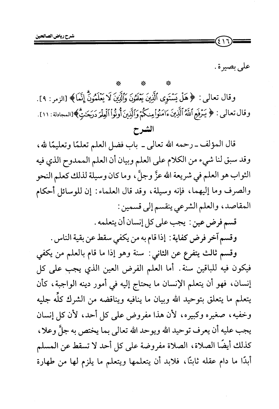 EXقال المؤلف النووي رحمه الله في كتابه رياض الصالحين باب فضل العلم تعلما وتعليما لله وقد سبق لنا شيء من الكلام على العلم وبيان أن العلم الممدوح الذي فيه الثواب هو العلم في شريعة الله عز وجل: وما كان وسيلة لذلك كعلم النحو والصرف وما إليهما فإنه وسيلة وقد قال العلماء: إن للوسائل أحكام المقاصد.