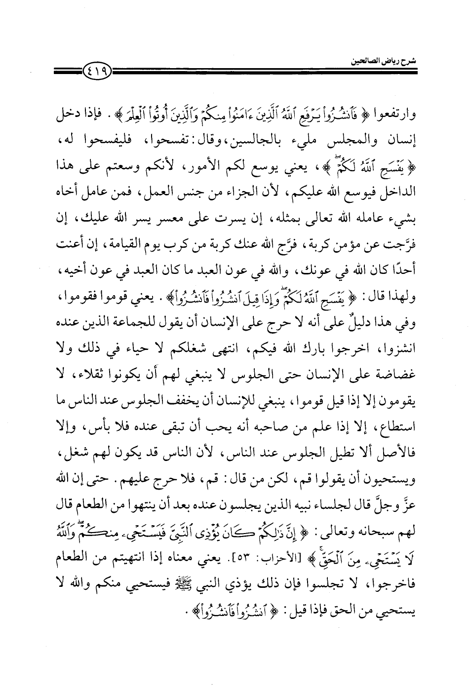 وارتفعوا {فانشزوا يرفع الله الذين آمنوا منكم والذين أوتوا العلم درجات} فإذا دخل إنسان والمجلس ملئ بالجالسين وقال تفسحوا فليفسحوا له يفسح الله لكم يعني يوسع لكم الأمور لأنكم وسعتم على هذا الداخل فيوسع الله عليكم لأن الجزاء من جنس العمل فمن عامل أخاه بشيء عامله الله تعالى بمثله إن أيسرت على معسر يسر الله عليك إن فرجت عن مؤمن كربة فرج الله عنك كربة من كرب يوم القيامة إن أعنت أحدا كان الله في عونك والله في عون العبد ما كان العبد في عون أخيه ولهذا قال: {فافسحوا يفسح الله لكم وإذا قيل انشزوا فانشزوا} يعني قوموا فقوموا وفي هذا دليل على أنه لا حرج على الإنسان أن يقول للجماعة الذين عنده انشزوا اخرجوا بارك الله فيكم انتهى شغلكم ولا حياء في ذلك لا حياء في ذلك ولا غضاضة على الإنسان حتى الجلوس لا ينبغي لهم أن يكونوا ثقلاء لا يقومون إلا إذا قيل قوموا ينبغي للإنسان أن يخفف الجلوس عند الناس ما استطاع إلا إذا علم من صاحبه أنه يحب أن تبقى عنده فلا بأس وإلا فالأصل ألا تطيل الجلوس عند الناس لأن الناس قد يكون لهم شغل ويستحيون أن يقولوا قم لكن من قال قم فلا حرج عليهم حتى إن الله عز وجل قال لجلساء نبيه الذين يجلسون عنده بعد أن ينتهوا من الطعام قال لهم سبحانه وتعالى: {إن ذلكم كان يؤذي النبي فيستحيي منكم والله لا يستحي من الحق} يعني معناه إذا انتهيتم من الطعام فاخرجوا لا تجلسوا فإن ذلك يؤذي النبي فيستحيي منكم والله لا يستحيي من الحق فإذا قيل: {انشزوا فانشزوا}