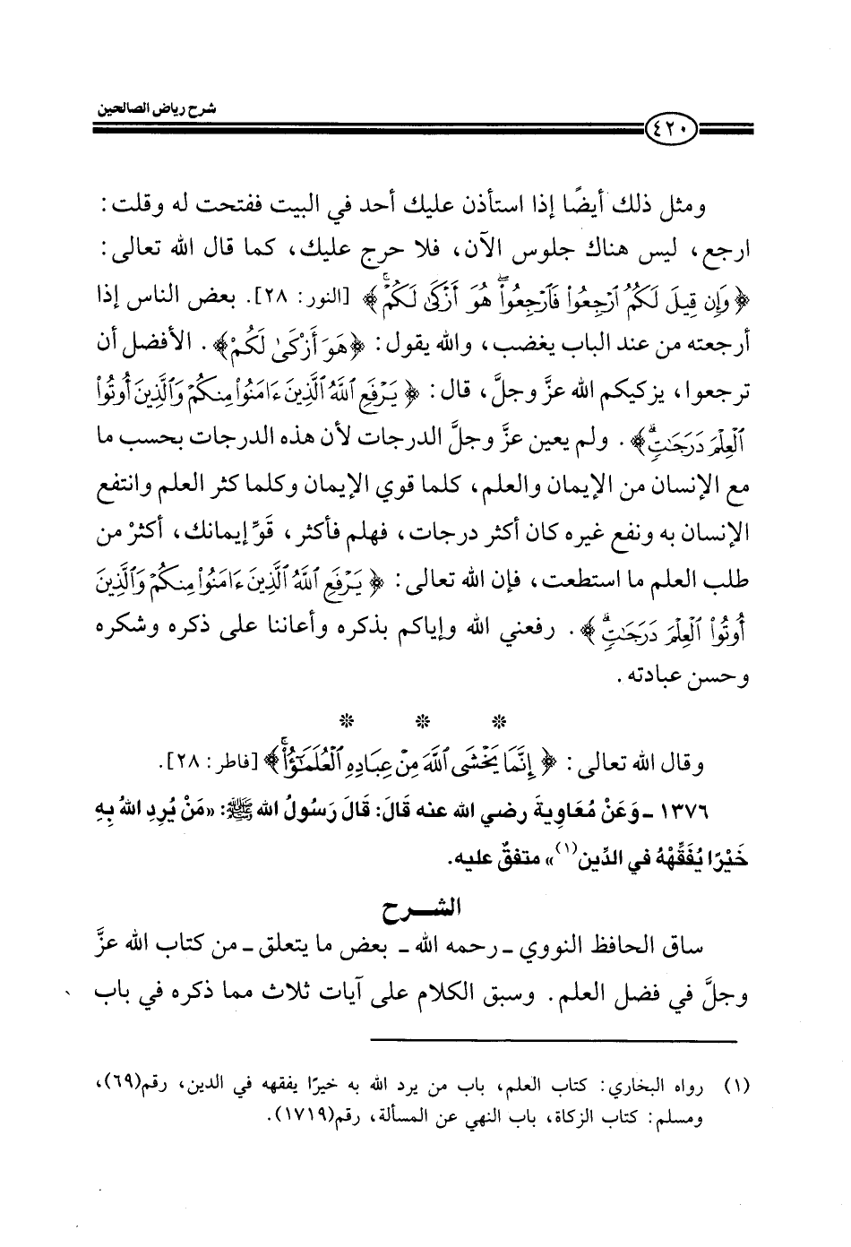 ومثل ذلك أيضا إذا استأذن عليك أحد في البيت ففتحت له وقلت ارجع ما في جلوس الآن فلا حرج عليك كما قال تعالى: {وإن قيل لكم ارجعوا فارجعوا هو أزكى لكم} بعض الناس إذا أرجعته من عند الباب يغضب والله يقول: {هو أزكى لكم} أحسن إن ترجعوا يعطيكم الله زكاءا يزكيكم عز وجل قال: {يرفع الله الذين آمنوا منكم والذين أوتوا العلم درجات} ولم يعين عز وجل الدرجات لأن هذه الدرجات بحسب ما مع الإنسان من الإيمان والعلم كلما قوي الإيمان وكلما كثر العلم وانتفع الإنسان به ونفع غيره كان أكثر درجات فهلم فأكثر قوي إيمانك أكثر من طلب العلم أكثر من بث العلم ما استطعت فإن الله تعالى: {يرفع الله الذين آمنوا منكم والذين أوتوا العلم درجات} رفعني الله وإياكم بذكره وأعاننا على ذكره وشكره وحسن عبادته.