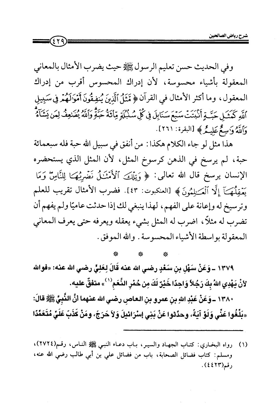 وفي الحديث حسن تعليم الرسول صلى الله عليه وسلم حيث يضرب الأمثال بالمعاني المعقولة بأشياء محسوسة لأن إدراك المحسوس أقرب من إدراك المعقول وما أكثر الأمثال في القرآن {مثل الذين ينفقون أموالهم في سبيل الله كمثل حبة} هذا مثل لو جاء الكلام هكذا: من أنفق في سبيل الله حبة فله سبعمائة حبة لم يرسخ في الذهن كرسوخ المثل فالمثل الذي يستحضره الإنسان يرسخ قال الله تعالى: {وتلك الأمثال نضربها للناس لعلهم يتفكرون} فضرب الأمثال تقريب للعلم وترسيخ له وإعانة على الفهم لهذا ينبغي لك إذا حدثت عاميا ولم يفهم أن تضرب له مثلا اضرب له المثل بشيء يعقله ويعرفه حتى يعرف المعاني المعقولة بواسطة الأشياء المحسوسة والله الموفق.