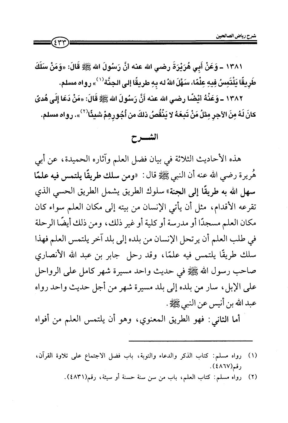 EXهذه الأحاديث الثلاثة في بيان فضل العلم وآثاره الحميدة عن أبي هريرة رضي الله عنه أن النبي صلى الله عليه وسلم قال: ومن سلك طريقا يلتمس فيه علما سهل الله له به طريقا إلى الجنة سلوك الطريق يشمل الطريق الحسي الذي تقرعه الأقدام مثل أن يأتي الإنسان من بيته إلى مكان العلم سواء كان مكان العلم مسجدا أو مدرسة أو كلية أو غير ذلك ومن ذلك أيضا الرحلة في طلب العلم أن يرتحل الإنسان من بلده إلى بلد آخر يلتمس العلم فهذا سلك طريقا يلتمس فيه علما وقد رحل جابر بن عبد الله الأنصاري صاحب رسول الله صلى الله عليه وسلم في حديث واحد مسيرة شهر كامل على الرواحل على الإبل سار من بلده إلى بلد مسيرة شهر & من أجل حديث واحد رواه عبد الله بن أنيس عن النبي صلى الله عليه وسلم.