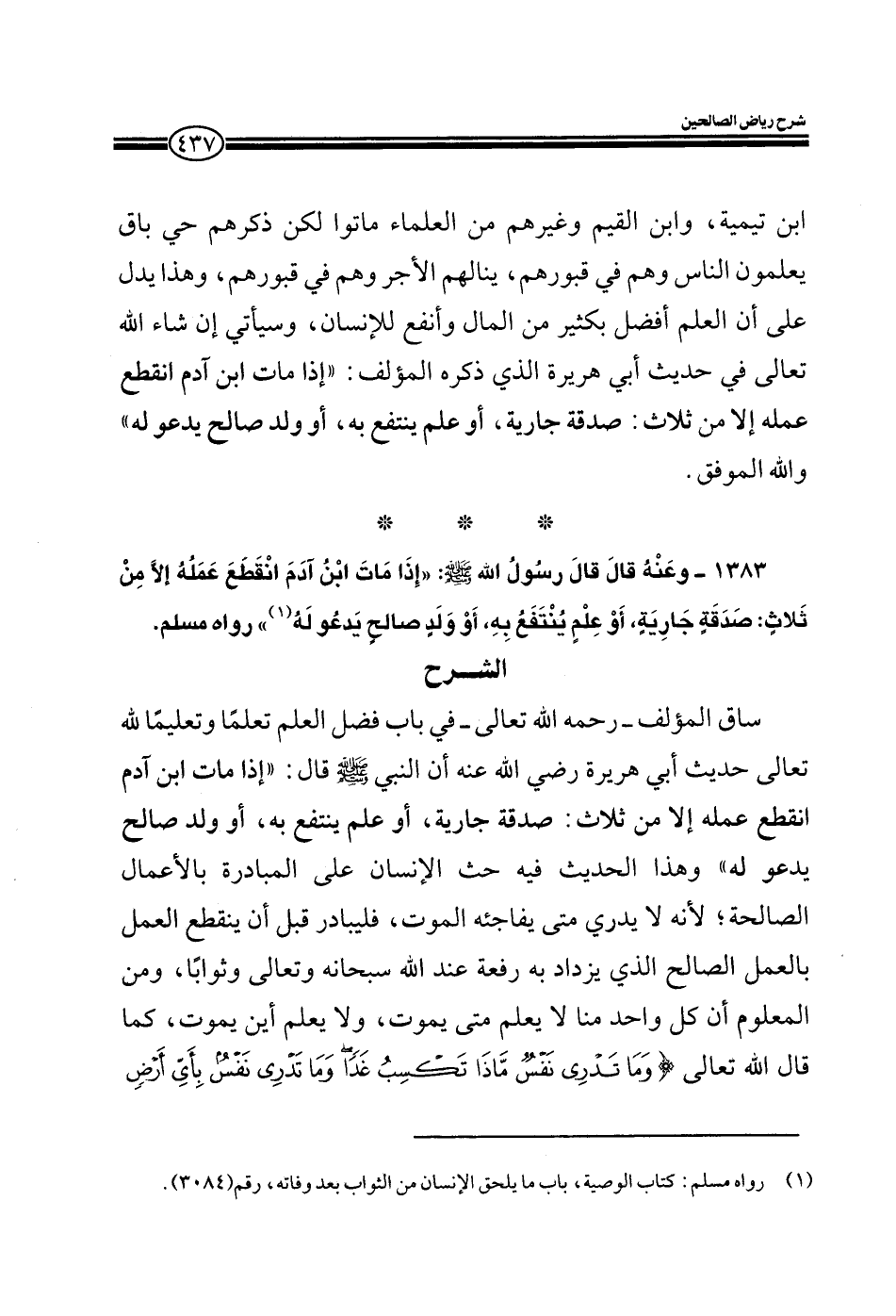 EXساق المؤلف النووي رحمه الله في كتابه رياض الصالحين في باب فضل العلم تعلما وتعليما لله عن أبي هريرة رضي الله عنه أن النبي صلى الله عليه وسلم قال: إذا مات ابن آدم انقطع عمله إلا من ثلاث: صدقة جارية أو علم ينتفع به أو ولد صالح يدعو له وهذا الحديث فيه الحث أعني حث الإنسان على المبادرة بالأعمال الصالحة لأنه لا يدري متى يفاجئه الموت فليبادر قبل أن ينقطع العمل بالعمل الصالح الذي يزداد به رفعة عند الله سبحانه وتعالى وثوابا ومن المعلوم أن كل واحد منا لا يعلم متى يموت ولا يعلم أين يموت كما قال الله تعالى: وما تدري نفس ماذا تكسب غدا وما تدري نفس بأي أرض