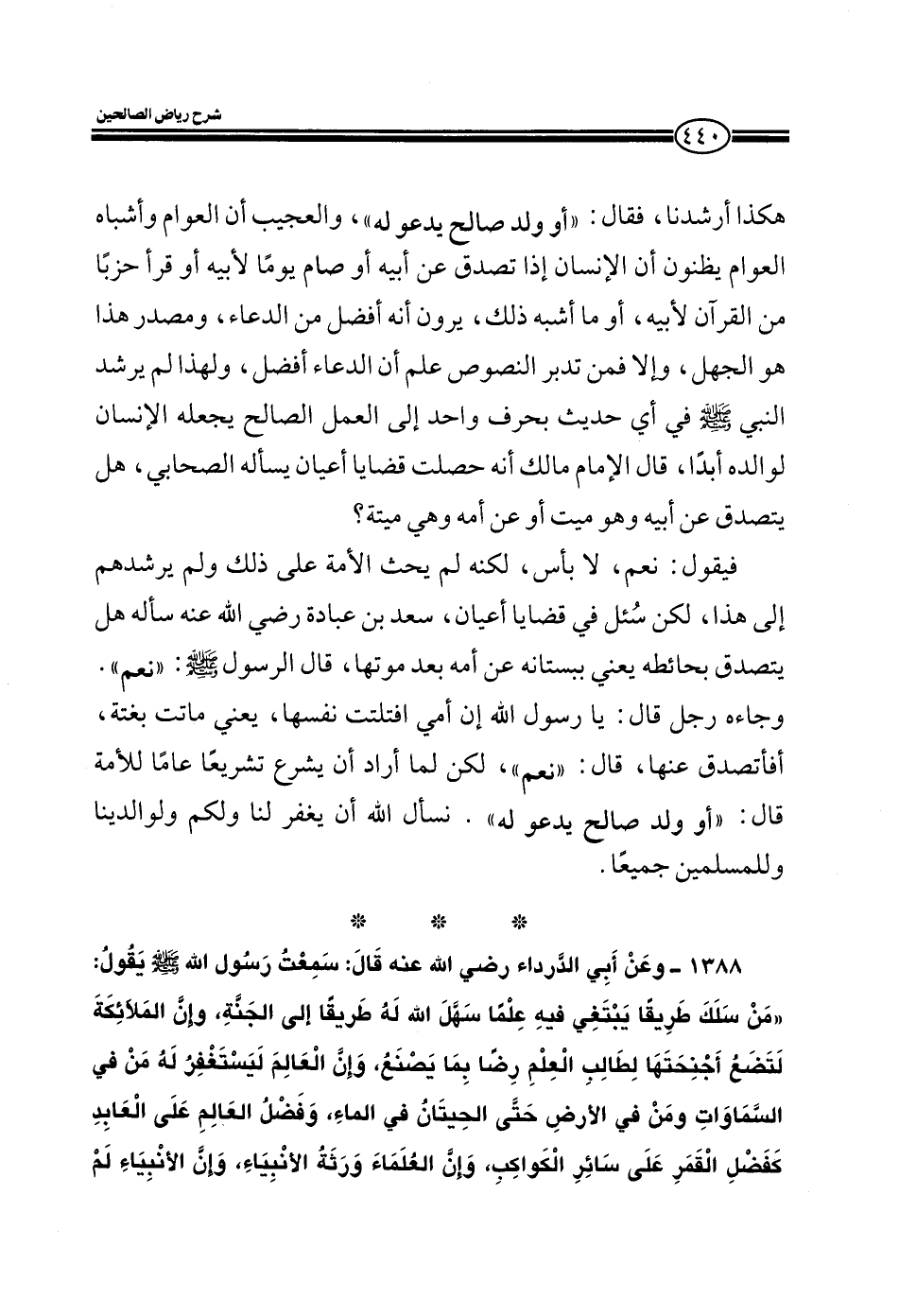 1388 - وعن أبي الدرداء رضي الله عنه قال سمعت رسول الله صلى الله عليه وسلم يقول من سلك طريقا يبتغي فيه علما سهل الله له طريقا إلى الجنة وإن الملائكة لتضع أجنحتها لطالب العلم رضا بما يصنع وإن العالم ليستغفر له من في السماوات ومن في الأرض حتى الحيتان في الماء وفضل العالم على العابد كفضل القمر على سائر الكواكب وإن العلماء ورثة الأنبياء وإن الأنبياء لم