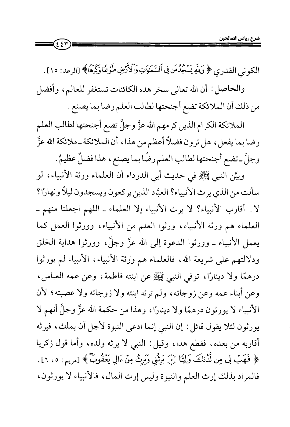 الملائكة الكرام الذين كرمهم الله عز وجل تضع أجنحتها لطالب العلم رضا بما يصنع أترون فضلا أعظم من هذا أن الملائكة ملائكة الله عز وجل تضع أجنحتها لطالب العلم رضا بما يصنع هذا فضل عظيم وبين النبي صلى الله عليه وسلم في حديث أبي الدرداء أن العلماء ورثة الأنبياء لو سألت من الذي يرث الأنبياء العباد الذين يركعون ويسجدون ليلا ونهارا لا أقارب الأنبياء لا لا يرث الأنبياء إلا العلماء اللهم اجعلنا منهم العلماء هم ورثة الأنبياء ورثوا العلم من الأنبياء وورثوا العمل كما يعمل الأنبياء وورثوا الدعوة إلى الله عز وجل وورثوا هداية الخلق ودلالتهم على شريعة الله فالعلماء هم ورثة الأنبياء الأنبياء لم يورثوا درهما ولا دينارا توفي النبي صلى الله عليه وسلم عن ابنته فاطمة وعن عمه العباس وعن أبناء عمه وعن زوجاته ولم ترثه ابنته ولا زوجاته ولا عصبته لأن الأنبياء لا يورثون درهما ولا دينارا وهذا من حكمة الله عز وجل أنهم لا يورثون لئلا يقول قائل إن النبي إنما ادعى النبوة لأجل أن يملك فيورثوا فيرثه أقاربه من ذلك فقطع هذا وقيل النبي لا يرثه ابنه وأما قول زكريا {فهب لي من لدنك وليا يرثني ويرث من آل يعقوب} فالمراد بذلك إرث العلم والنبوة وليس المال فالأنبياء لا يورثون