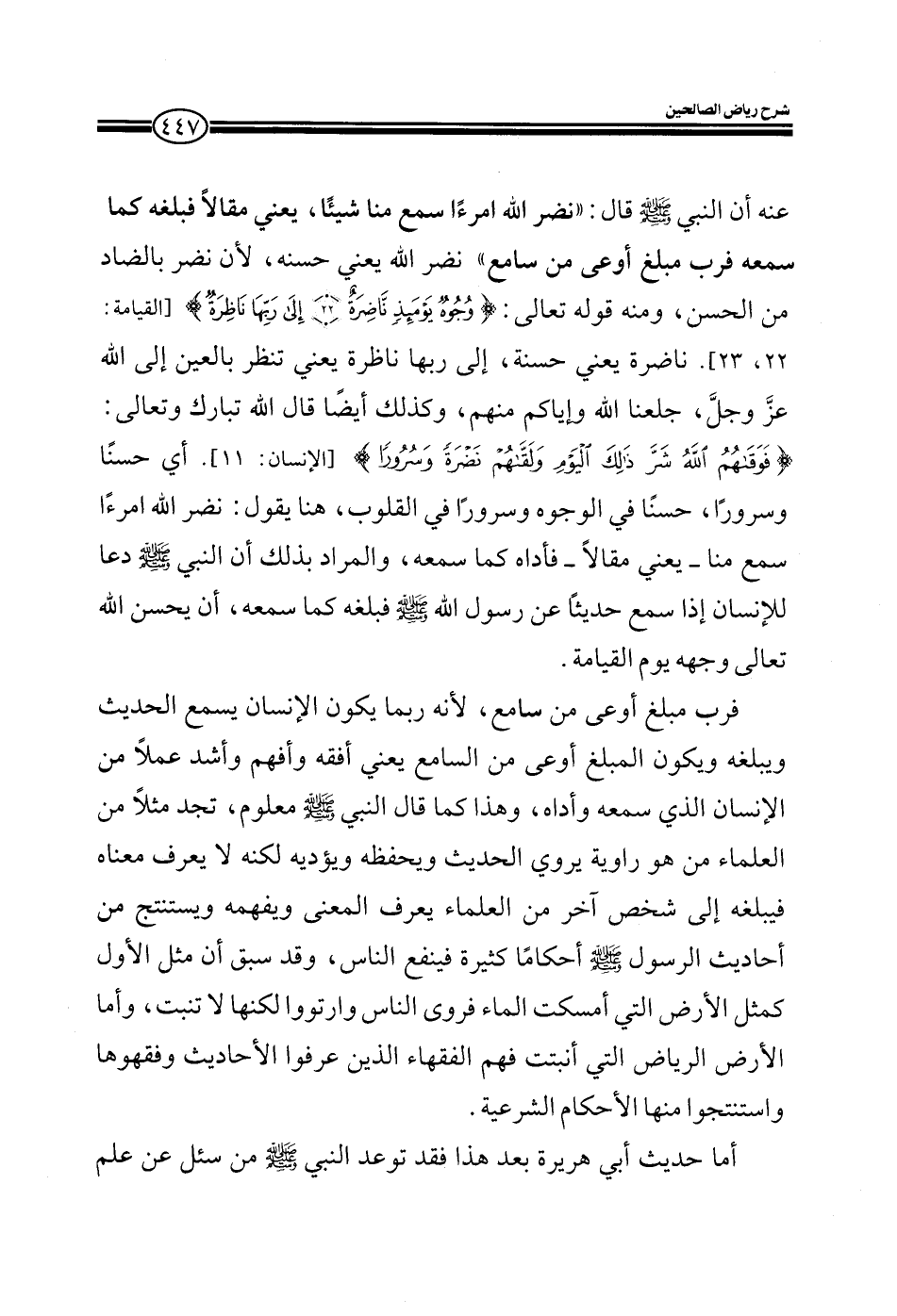 عنه أن النبي صلى الله عليه وسلم قال نضر الله امرءا سمع منا يعني مقالا فبلغه كما سمعه فرب مبلغ أوعى من سامع نضر الله يعني حسنه لأن نضر بالضاد من الحسن ومنه قوله تعالى وجوه يومئذ ناضرة إلى ربها ناظرة ناضرة يعني حسنة إلى ربها ناظرة يعني تنظر بالعين إلى الله عز وجل جعلنا الله وإياكم منهم وكذلك أيضا قال الله تبارك وتعالى {فوقاهم الله شر ذلك اليوم ولقاهم نضرة وسرورا} أي حسنا وسرورا حسنا في الوجوه وسرورا في القلوب هنا يقول نضر الله امرءا سمع منا يعني مقالا فأداه كما سمعه والمراد بذلك أن النبي صلى الله عليه وسلم دعا للإنسان إذا سمع حديثا عن رسول الله فبلغه كما سمعه أن يحسن الله تعالى وجهه يوم القيامة.