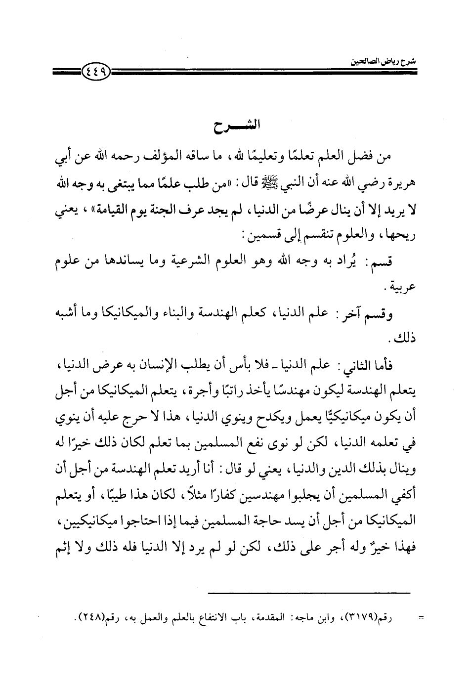 العلوم تنقسم إلى قسمين قسم يراد به وجه الله وهو العلوم الشرعية وما يساندها من علوم عربية وقسم آخر علم الدنيا كعلم الهندسة والبناء والميكانيكا وما أشبه ذلك فأما الثاني علم الدنيا فلا & بأس أن يطلب الإنسان به عرض الدنيا يتعلم الهندسة ليكون مهندسا يأخذ راتبا وأجرة يتعلم الميكانيكا من أجل أن يكون ميكانيكيا يعمل ويكدح وينوي الدنيا هذا لا حرج عليه أن ينوي في تعلمه الدنيا لكن لو نوى نفع المسلمين بما تعلم لكان ذلك خيرا له وينال بذلك الدين والدنيا يعني لو قال أنا أريد تعلم الهندسة من أجل أن أكفي المسلمين أن يجلبوا مهندسين كفارا مثلا لكان هذا طيبا أو يتعلم الميكانيكا من أجل أن يسد حاجة المسلمين فيما إذا احتاجوا ميكانيكيين فهذا خير وله أجر على ذلك لكن لو لم يرد إلا الدنيا فله ذلك ولا إثم