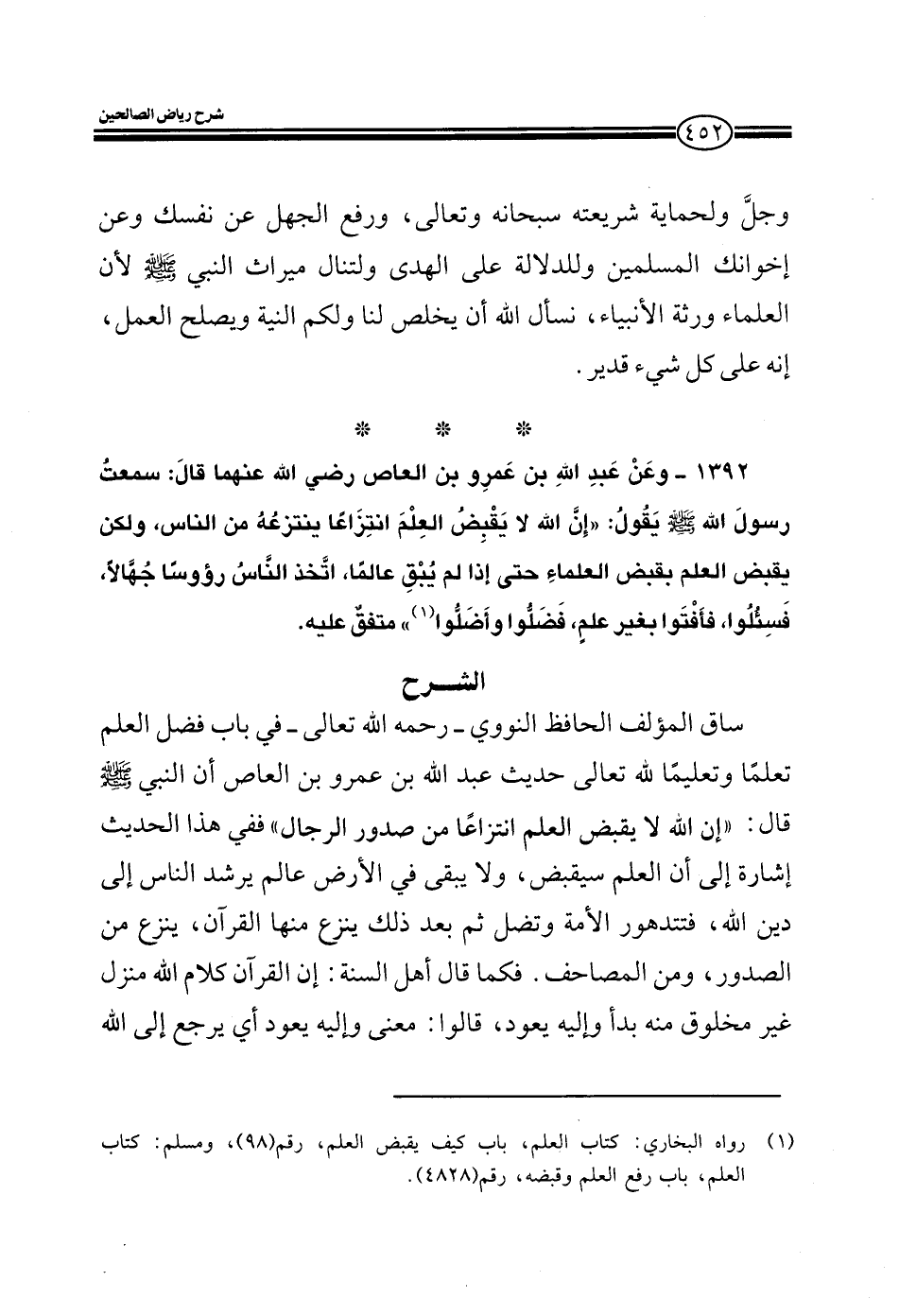 1392 - وعن عبد الله بن عمرو بن العاص رضي الله عنهما قال سمعت رسول الله صلى الله عليه وسلم يقول إن الله لا يقبض العلم انتزاعا ينتزعه من الناس ولكن يقبض العلم بقبض العلماء حتى إذا لم يبق عالما اتخذ الناس رؤوسا جهالا فسئلوا فأفتوا بغير علم فضلوا وأضلوا متفق عليه